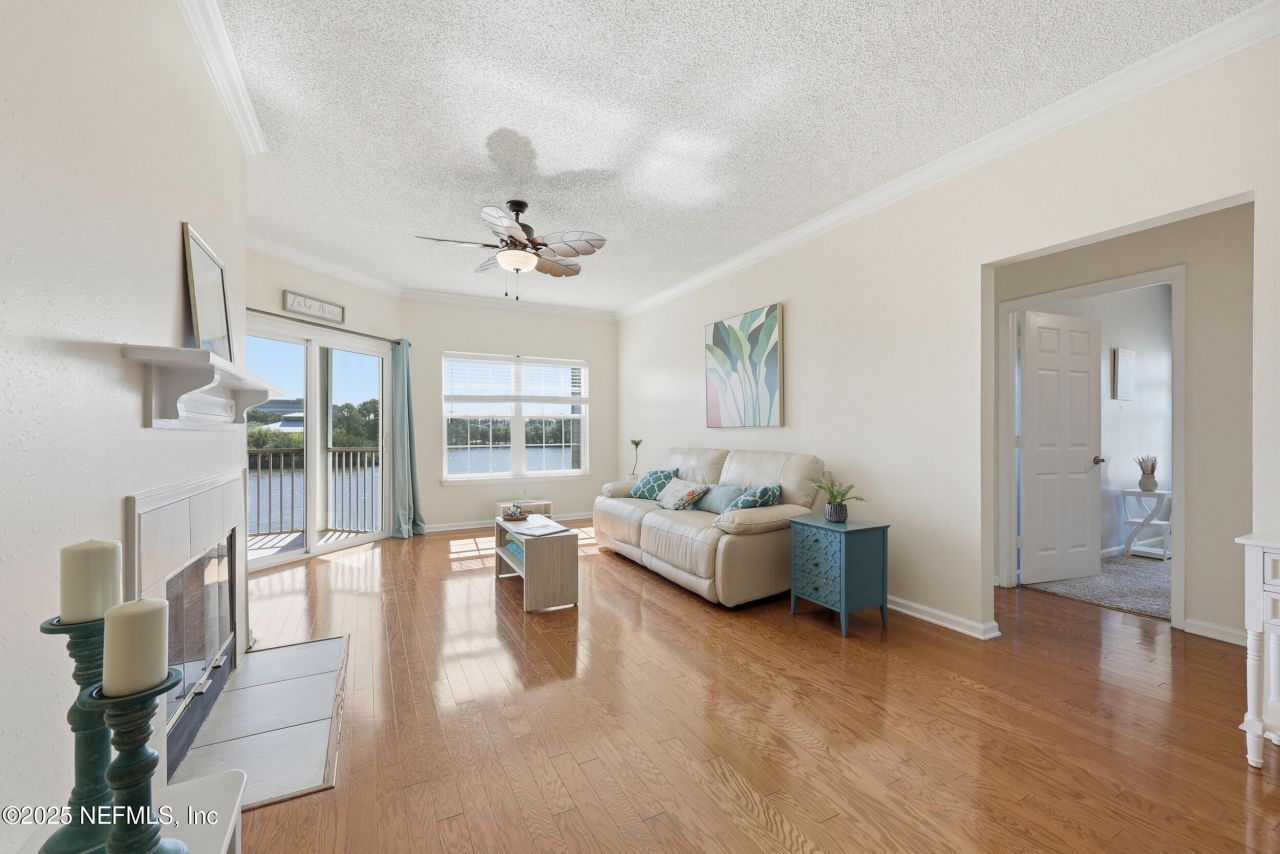 Bright and airy end unit, 1340 Sq ft, GARAGE Included, backs up to a 22 acre lake with expansive open sky and lake views that can be enjoyed from a large screened-in porch, living room, dining room, kitchen, and all 3 bedrooms! Gleaming hardwood floors, high ceilings with crown molding, fireplace, split floor plan, private master suite with 2 spacious walk in closet and sliding glass doors to the porch, garden tub and double sinks, 42'' kitchen cabinets, washer, dryer, refrigerator, glass top range, DW, new Microwave, TWO attached outside storage closets, NEW ROOF 2024, Gated, Plentiful amenities: beautiful RESORT STYLE POOL and jacuzzi overlooks the lake with fountain/dock/kayak launch, picnic tables and grills, also fitness center, pickleball, tennis, basketball, playground, RV/Boat parking, car wash station, clubhouse. Prime location: walkable to restaurants and shopping at St. Johns TC with just a short drive to UNF and the Beach! Nearby freeway access.