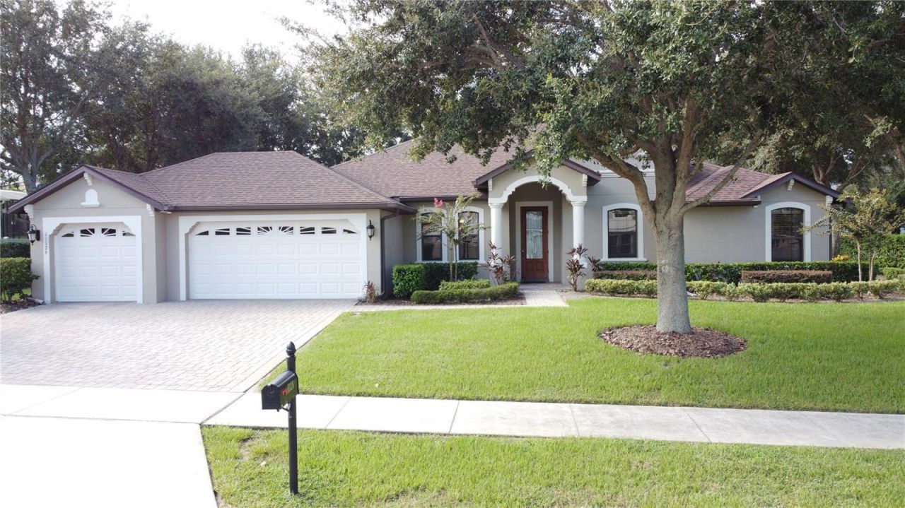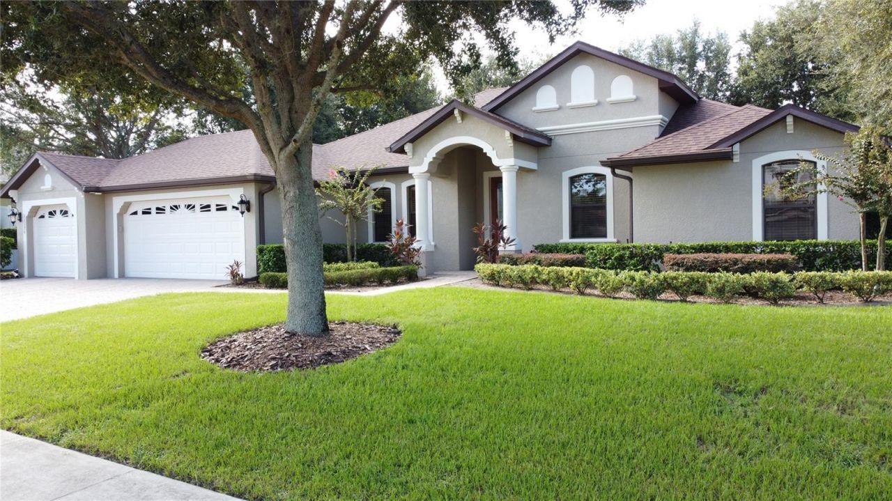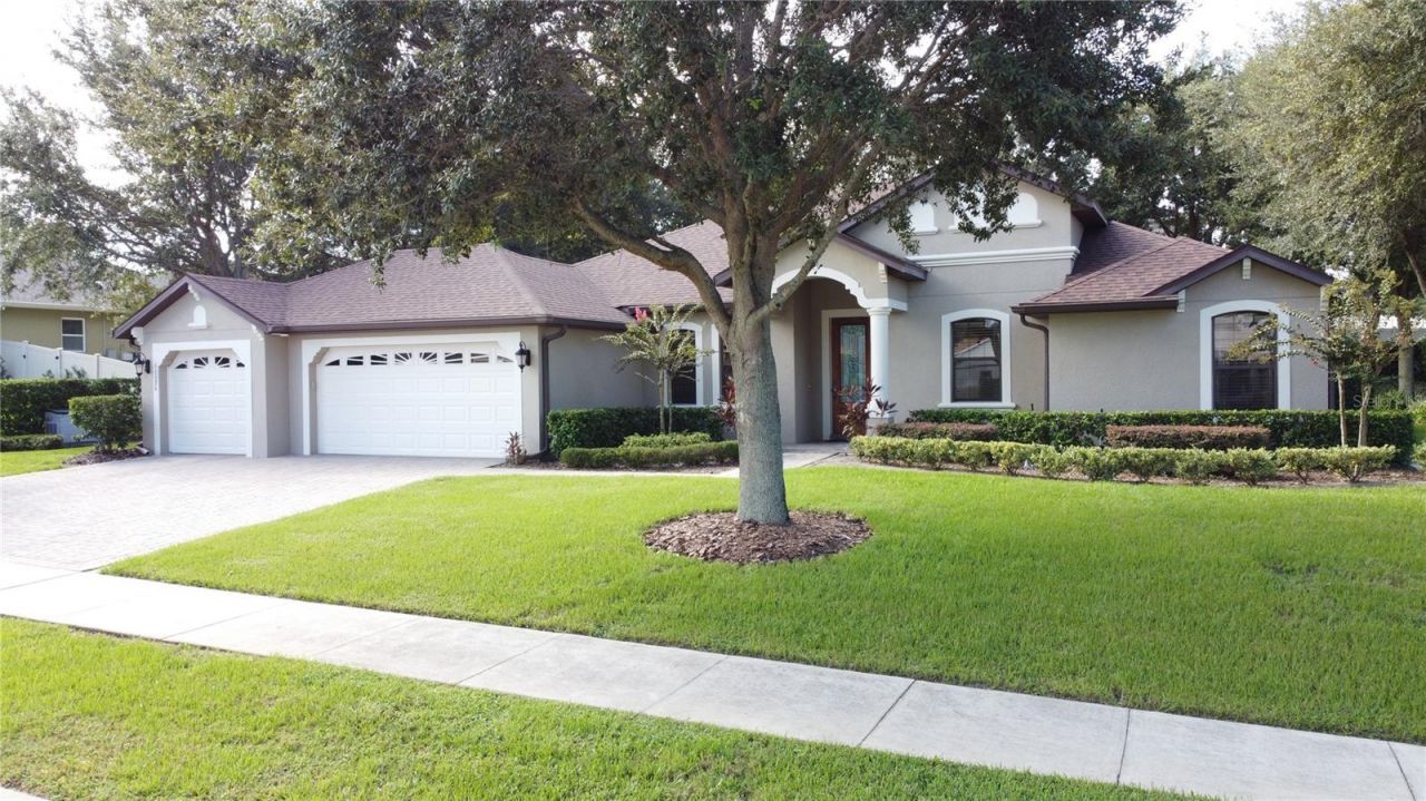 Immaculate custom built 3 bedroom, 2 bath with a den. Beautiful open floor plan with large spacious kitchen that overlooks the family room with gas fireplace. This split bedroom plan also offers formal dining and separate breakfast nook. The office with French doors can also be used as a fourth bedroom. The kitchen offers granite counter tops, maple cabinets, walk in pantry and breakfast bar. The primary suite has tray ceilings, his and hers walk in closets with views of the rear yard. The primary bathroom is on suite with dual vanities, garden soaking tub, linen closet and walk in shower. This large .37 acre lot has lush landscaping, large lanai, three car garage and more. This elegant home with classic facades has timeless curb appeal.