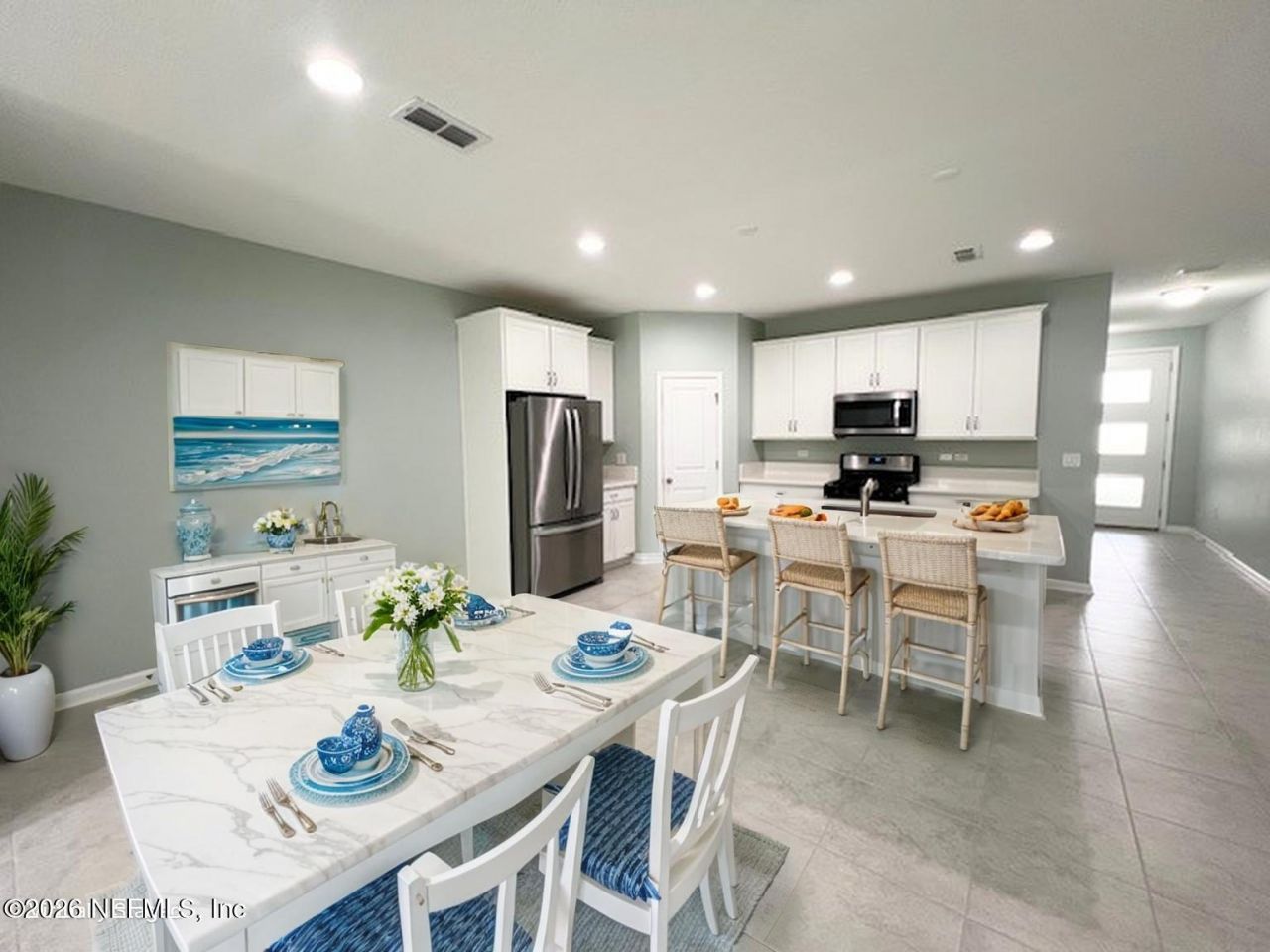 Only Unit Available, Stunning 3-Bedroom Townhome in Desirable Gated East Village! Nice Water Views, this Beautiful 3-bedroom, 2.5-Bathroom home with Large Loft which can serve as an Office or another Living Space. The Home offers over 1,900 sq. ft. of Living Space and Includes an Attached One-Car Garage. As you step inside, you'll be Welcomed by Elegant Tile Flooring Throughout the First Floor. The Kitchen is a Standout Feature, Showcasing White Cabinets, Quartz Countertops, and Stainless-Steel Appliances. Powder Bath Downstairs with Pedestal Sink. Upstairs, you'll find all Three Bedrooms, including a Generous Primary Suite with an Ensuite Bath that Includes Dual Sinks, a Large Walk-In Shower, and Walk-in closet. Lawncare is included with HOA. Nearby Atlantic Coast HS, Convenient to Many Amenities in Baymeadows and close to all Major Interstates. Hurry before its Gone.