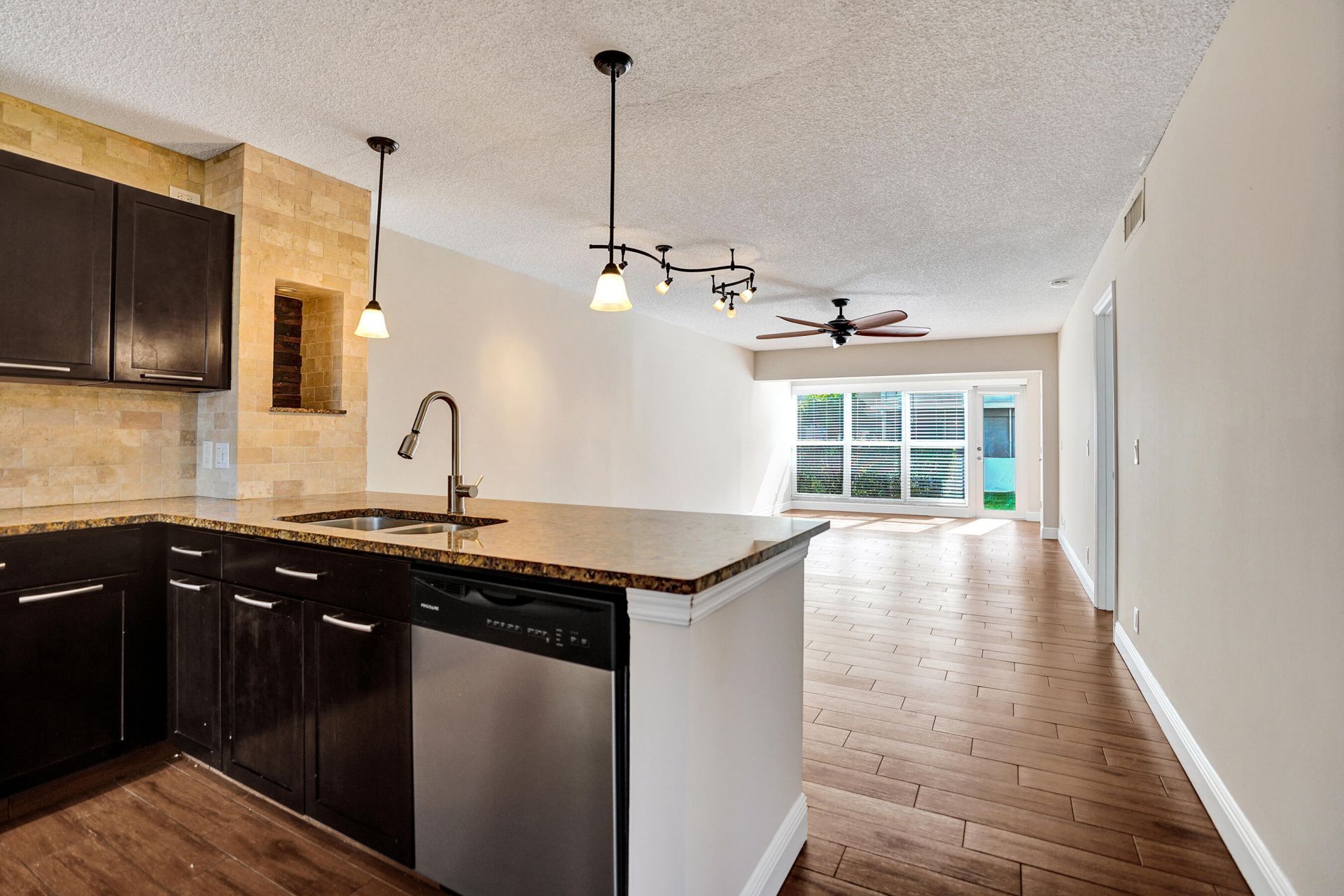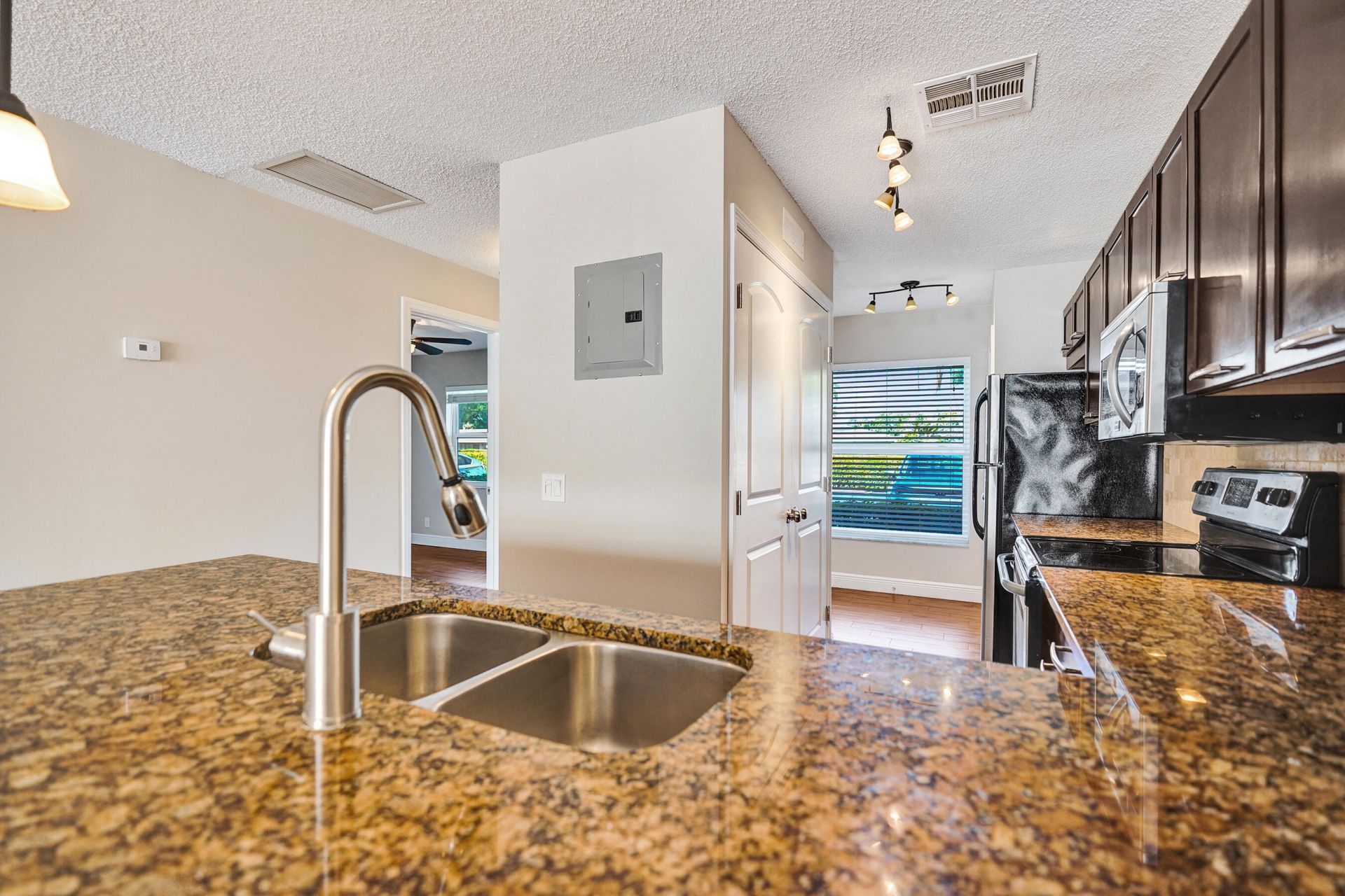 Exceptional 1st floor renovation with custom home designer finishes. Spanning 1,167 square feet of contemporary living space, this home features 2 spacious bedrooms and 2 luxurious bathrooms. Newly painted and with flooring that is primarily a stylish 24 x 6 ceramic wood tile, the property shines. Plus it showcases all hurricane impact glass windows and doors. The open kitchen design integrates with the living area and boasts custom wood cabinetry, granite countertops, tumbled marble backsplash, a double door laundry closet with full size washing machine (with cabinetry above). The bathrooms and master dressing area are equipped with modern granite- top vanities, custom tiled walk-in showers and 2 vessel sinks in the master suite And the property is equipped with a 2026 AC SYSTEM. . The residence spans 1,167 square feet of contemporary living space-where modern design meets comfort. This home features two spacious bedrooms and two luxurious bathrooms-each thoughtfully designed with high end finishes. A newly painted interior and 24 x 6 ceramic wood tile throughout (except for the newly carpeted master bedroom) make this property shine.. The home showcases all PGT FLORIDA 7/16th inch hurricane impact glass windows, a PGT FLORIDA hurricane impact French out swing back door with 7/16th glass and a JELD-WEN hurricane impact front door- making this residence as secure as it is stylish. The heart of the residence is the open kitchen design that seamlessly integrates with the living area, creating a perfect flow for entertaining. The kitchen boasts custom wood cabinetry, granite countertops, tumbled marble back splash and upper walls, dual 9 deep stainless steel sinks, a double door laundry closet with full size side-by-side washing machine and dryer (as well a coffee bar and additional cabinetry above) and a separate full size pantry closet. The bathrooms and master dressing area offer modern granite-top vanities and custom tiled walk-in showers, while the master suite boasts 2 Fresca Adoura vessel sinks . The property is equipped with a 2026 energy efficient 2-ton 14.3 SEER Rheem Endeavor AC system, a 2020 Rheem 28-gallon water heater (with 3500 watt elements) and a USA-manufactured Eaton indoor load center (electrical panel).Plus you'll enjoy the comfort of three oversized paddle fans that enhance airflow throughout the rooms. EQUIPMENT: AC SYSTEM: Installed in 2026 RHEEM Endeavor Line Select Series iC RHEEM CONDENSER M# WSA14AY24AJ1NA S# W512519589 2 Ton; 14.3 SEER2, 11.7 EER2; 208/230/1/60, R-454B Refrigerant;Fully Louvered Steel Cabinet; Optimized 7mm Coil Design; PlusOne Refrigerant Detection System 2; Single Stage Scroll Compressor; 76 dBA. RHEEM HANDLER M# RB2TY2417STANMJB05 S#: W402513103 Constant Torque Motor, Two-Stage Airflow, 14.3 SEER2; Thermal Expansion Valve. RHEEM WATER HEATER: (2020) M# PROE28S2RU95 S# Q402073924 28 gallon capacity; Isolated tank design;Resistored 3500 watt stainless steel upper and lower heating elements; Premium grade anode rod; Over-temperature protector; Automatic thermostat; Ruudglas tank lining; T & P relief valves. PGT FLORIDA HURRICANE IMPACT WINDOWS (2021) M# PGT 7700A Series 7/16th thickness: Window Specs: MDCA Butacite PVB; 16 CFR 120111; ANSI Z971 2015; 7/16th U A SGCC #2472; 0013 05/28/2021 L2. PGT FLORIDA HURRICANE IMPACT BACK DOOR M# PGT 101 Series French Outswing door with 7/16th glass JELD-WEN HURRICANE IMPACT FRONT DOOR M# FRC JEL-M-2 S# 11-02604243 Steel Wood Edge Door (EDSL); Strong and durable the door includes include wood stiles and rails with mitred top corners to prevent water absorption. Galvanized steel facings. EATON INDOOR LOAD CENTER (ELECTRICAL PANEL) M# BRP12B100 FRESCA VESSEL SINKS (2) M# FVS8110WH Fresca Adour white ceramic vessel sinks are beautiful basins with a smooth, round shape.The overall dimensions are 15.5''W x 15.5''D x 6''H. It commands attention, yet is elegant and stylishly simple. GLACIER BA
