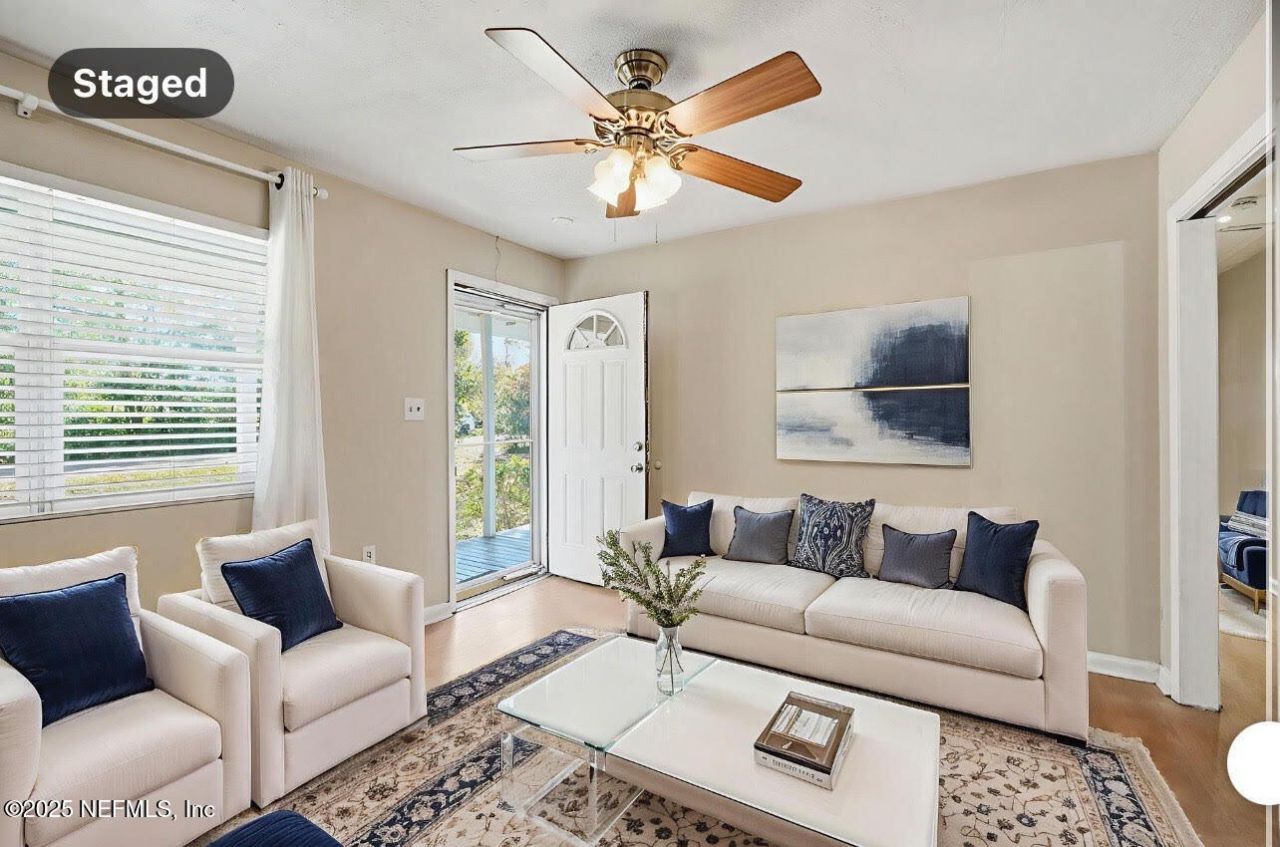 Welcome home to this charming 3-bed, 2-bath country retreat offering 1,200 sq ft of comfortable living and recent interior and exterior paint for a fresh, move-in-ready feel. Nestled at the very end of a dead-end street, this home offers privacy, peaceful surroundings, and mature trees offering shade and tranquility. Enjoy your coffee on the front porch swing, the perfect spot to start your day. Inside, you'll find a bright and inviting living area with laminate wood flooring throughout and tile in the kitchen and baths. A versatile flex space just off the living room can easily become a home office, playroom, hobby room, or cozy reading nook. The kitchen features a high-top breakfast bar, an eat-in layout, and a spacious laundry room large enough for a washer, dryer, and deep freezer.The guest bathroom includes a tub/shower combo, while the primary suite offers its own bath with a tiled walk-in shower. Outdoor lovers will appreciate the NO HOA and NO CDD fees, bring the boat, camper, ATV, and all your toys. The property includes a fenced backyard, storage shed, gazebo, covered front porch, covered back porch, and a convenient side patio for easy entry and exit. With RLD-60 zoning, the possibilities are wide open to create a mini farm, garden, or simply enjoy the serenity of this quaint country oasis, just sitting under half an acre of land. Freshly painted, move-in ready, and full of charm, this home is ready to welcome you.