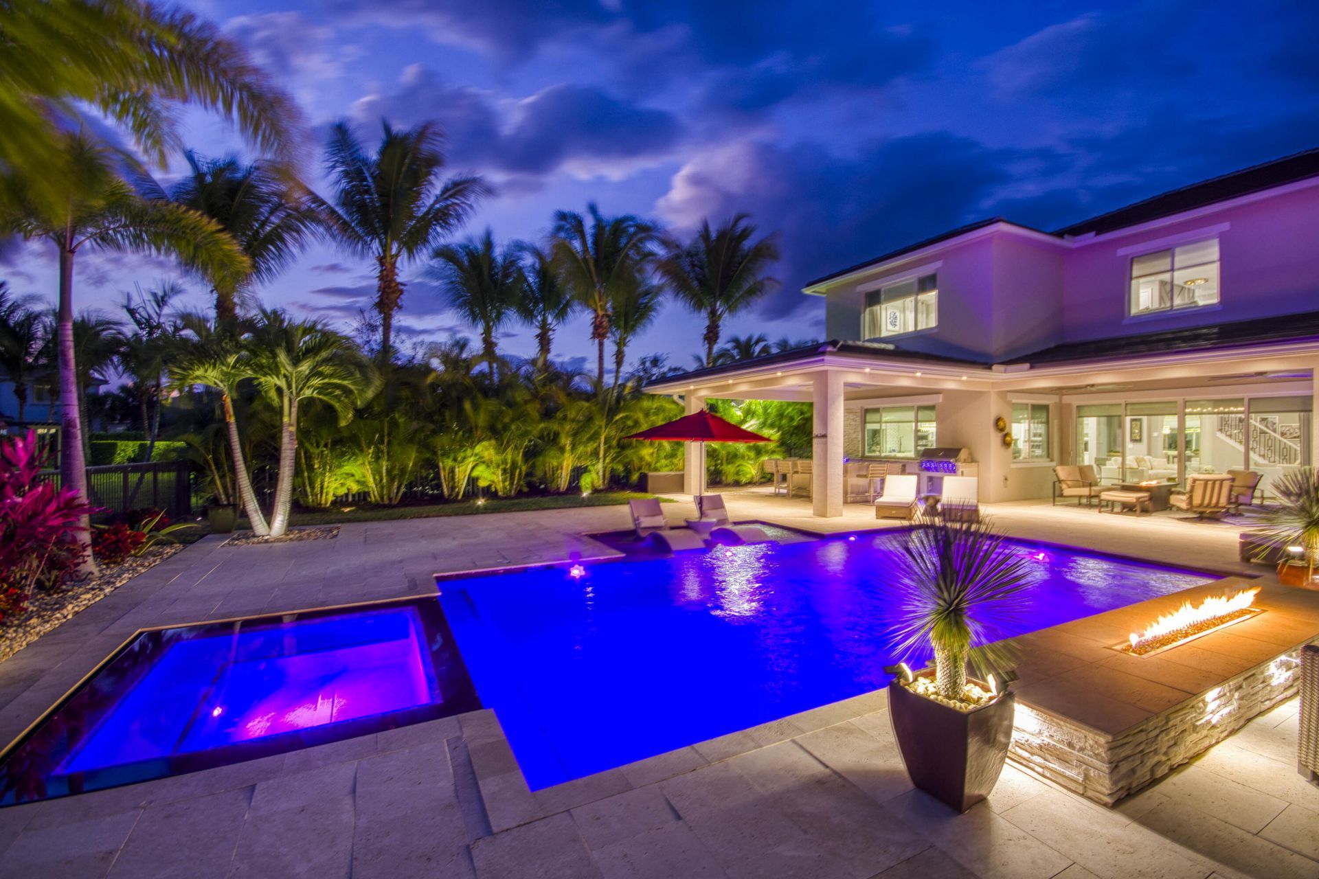 Private Resort-Style Lakefront Estate in La Terre at Avenir! Welcome to one of the most exceptional lakefront residences within Avenir, a fully customized lakefront estate located in the exclusive enclave of La Terre. Positioned on a rare, oversized corner homesite with sweeping water views, this five-bedroom, four full and two half bath residence offers over 4,200 square feet of refined living, where timeless design meets modern luxury. Built in 2023 and curated with a restoration-inspired aesthetic, the home blends clean architectural lines with warm, organic textures and bespoke craftsmanship throughout. From the moment you enter, a gracious foyer introduces wood-look porcelain flooring, a soft neutral palette, and thoughtfully layered finishes that create an atmosphere of understated elegance. A versatile front flex space offers the perfect setting for a private study, library, or formal sitting room, adding both function and sophistication. At the heart of the home, an expansive open-concept design unfolds, seamlessly connecting the great room, chef's kitchen, and dining areas. A striking dual-sided fireplace feature wall creates architectural definition while maintaining an airy, cohesive flow, serving as both a focal point and a functional design element. The chef's kitchen is a statement in both form and function, appointed with custom white shaker cabinetry, quartz countertops, and an oversized center island with seating and abundant storage. Premium Monogram stainless steel appliances including double ovens and a six-burner gas range anchor the space with professional-grade performance. A built-in buffet with beverage refrigeration enhances the adjacent dining area, creating a refined yet effortless entertaining experience. Expansive windows and dual sliding glass doors flood the interiors with natural light, framing tranquil lake views and seamlessly blending indoor and outdoor living. Upstairs, rich dark wood flooring continues the home's warm, restoration-inspired aesthetic. A spacious loft offers a secondary living retreat, while four bedrooms, including the luxurious primary suite, are thoughtfully positioned for privacy. A first-floor guest suite provides ideal accommodations for visitors or multigenerational living. The primary suite serves as a private sanctuary, complete with a sitting area, tray ceiling detail, statement chandelier, and serene water vistas. The spa-inspired bath elevates daily living, featuring a soaking tub, dual vanities with dedicated dressing areas, and a dramatic glass-enclosed dual rain shower wrapped in floor-to-ceiling marble-look tile. Designed as a true wellness retreat, the shower also functions as a fully integrated steam room with an expansive built-in bench. A custom walk-in closet completes the suite. Step outside into a private resort designed to rival the finest luxury retreats. The outdoor living space is nothing short of spectacular, anchored by a custom saltwater pool and spa featuring cascading waterfalls, a shaded sun shelf, integrated seating, and dramatic fire elements that transform the ambiance from day to evening. Expansive lounge areas and multiple entertaining zones create a setting equally suited for intimate gatherings or large-scale events. The covered lanai is fully outfitted for elevated entertaining, featuring a complete summer kitchen with bar seating, hibachi-style griddle with side burners, dedicated grill station, oversized bar island, three beverage refrigerators, a built-in ice maker, and a full prep sink. An outdoor television and integrated sound system complete the experience, while a private cabana bath adds convenience. Framed by lush tropical landscaping, a fully fenced yard, and peaceful lake frontage, this outdoor environment delivers privacy, beauty, and a lifestyle rarely found in new construction communities. Beyond its visual appeal, the residence is enhanced by infrastructure-level upgrades that set it apart. A full-home generator en