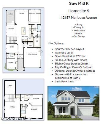 The Saw Mill floor plan blends timeless luxury with top-quality craftsmanship to create a beautifully upgraded home in Mariposa - the first neighborhood in the exciting new master-planned community of EverRangeCurb appeal shines from the start with a paver driveway and welcoming exterior. The open-concept main level offers effortless spaces for living, dining, and entertaining, all anchored by a stunning designer kitchen. Dual-toned cabinetry pairs a taupe island with a white linen perimeter and stacked cabinets to the ceiling, complemented by upgraded quartz countertops, an oversized pantry, and a spacious breakfast island perfect for gathering. Luxury vinyl plank flooring flows throughout the entire downstairs, including the Owner's Retreat and even the stairs, creating a seamless and durable foundation for everyday living.An open railing staircase with metal spindles adds a modern architectural touch, leading to a tremendous upstairs retreat ideal for movie nights, game days, or a secondary lounge. The downstairs guest room and upstairs secondary bedrooms provide privacy and flexibility for family and visitors alike, while the sleek study offers the perfect space for a home office or refined sitting room.Your grand Owner's Retreat delivers a peaceful escape with a spa-inspired bath and generous walk-in closet. Enjoy quiet mornings or relaxing evenings on the spacious lanai, creating the perfect backdrop for life in one of Jacksonville's newest communities.