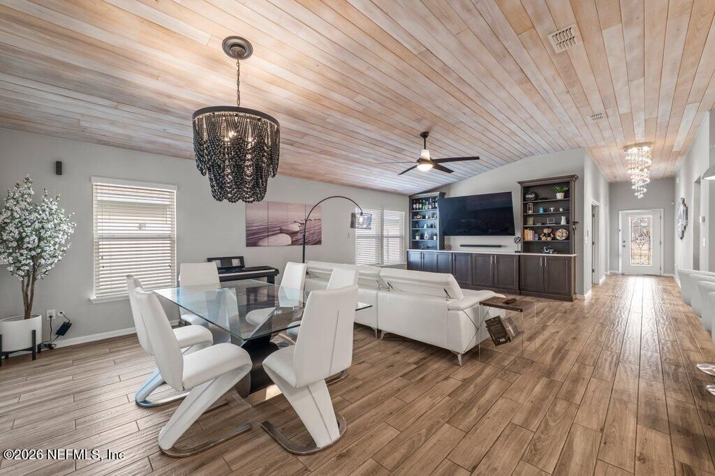 Welcome Home! This is one you won't want to miss- with a thoughtfully upgraded living space, blending warmth, character, and modern design in all the right ways.Step inside to an open floorplan that feels both spacious and inviting. Wood-look tile flows throughout the main living areas, creating a clean, cohesive look that is as durable as it is beautiful. The living room is anchored by stunning custom built-ins surrounding the TV -- a true focal point that adds both style and functionality.The kitchen is a standout. Two-toned cabinetry paired with quartz countertops gives it a fresh, designer feel, while the island offers the perfect gathering space for entertaining. Look up and you'll find one of the home's most charming features -- a custom tongue-and-groove pine wood ceiling that adds warmth and character you simply don't see every day. Luxury light fixtures throughout elevate the entire space. The primary suite is a retreat of its own, featuring two large custom closets for exceptional storage. The ensuite bath offers a dual sink vanity and a spacious walk-in shower designed for comfort and ease.Function meets practicality with additional storage just off the garage entry and a well-appointed laundry space -- thoughtful details that make daily life seamless.Incredible, well-kept garage, currently used as a home gym offers a one of a kind, privacy pull down screen for the optimal man cave area! Allow fresh air in, but maintain complete privacy from the street! Step outside and unwind on your preserve lot, where privacy and peaceful wooded views create the perfect backdrop for morning coffee or relaxing evenings. This lot offers large side yards AND the benefit of double gates. Newer TRANE HVAC system was recently installed, so this home is truly worry free! 12520 Itani Way offers upgraded design, intentional storage, and serene outdoor living -- all in a growing Jacksonville community that feels tucked away yet conveniently located.