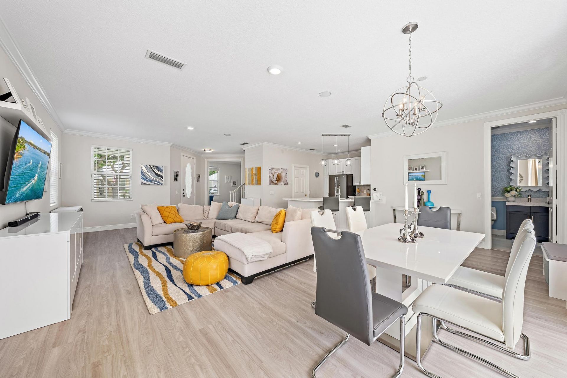 This 3BR + den, 2.5BA CBS home is ideally located in New Haven at Abacoa. The open-concept layout is light-filled and well-designed, with no wasted space. The kitchen features quartz countertops, subway tile backsplash and a spacious pantry. The backyard is thoughtfully upgraded with an extended tiled patio, artificial turf, and PVC fencing, with room to add a pool. The primary suite offers a newly renovated bath with an oversized shower, soaking tub, and Pottery Barn vanity with matching floating shelves. Downstairs, you'll also find a renovated powder bathroom and new LVP flooring. Roof 2023. HVAC 2024. Walk to A-rated schools, popular restaurants, and stores and enjoy living in the heart of Jupiter!