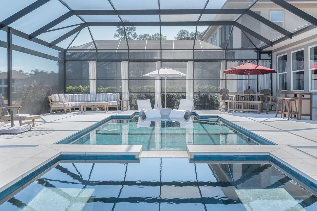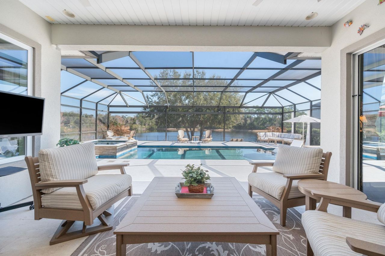 Located in the highly sought-after Palencia community in St Johns County, just north of downtown St Augustine, this exceptional 5-bedroom, 3.5-bath home offers luxury living with stunning views and extensive upgrades throughout. Originally built as the community model, this property showcases thoughtful design details such as tray ceilings, crown molding, wainscoting, plantation shutters, built-in indoor/ outdoor surround sound, 2 large walk-in pantries, and hardwood floors throughout. The kitchen/family room layout is open and spacious, designed for both entertaining and comfortable everyday living. The large gourmet kitchen provides ample custom cabinetry, a butlers pantry and an oversized island. Thoughtfully designed, the kitchen, dining area, family room and covered lanai, flow seamlessly together to create a connected and inviting living and entertaining space. The primary en-suite bedroom, located on ground level, offers beautiful views of the pool, the preserve and water views beyond. The primary en-suite is truly spa-like with an oversized walk-in shower, soaking tub, premium tile and multiple vanities. Upstairs, theres a large flex space which can be used as a den, sitting room, or a kids play area. There is also a spacious media room which offers the perfect setting for movie nights and game days. Step outside to the ultimate Florida indoor-outdoor living experience. The main living areas open up to a large patio and expansive views of a luxurious screened-in pool with ample decking, a large pond, a preserve, and beyond to Palencias championship golf course. This home also offers a second-story balcony overlooking the pool and facing East for the morning sunrises; as well as a West-facing balcony perfect for catching epic Florida sunsets. Residents of Palencia enjoy resort-style amenities, including tennis and pickleball courts, multiple swimming pools, a fitness center, miles of walking and biking trails, neighborhood parks and playgrounds, a boardwalk to the Intracoastal Waterway, gated entrance and community events. This home truly offers an unbeatable blend of luxury and lifestyle.