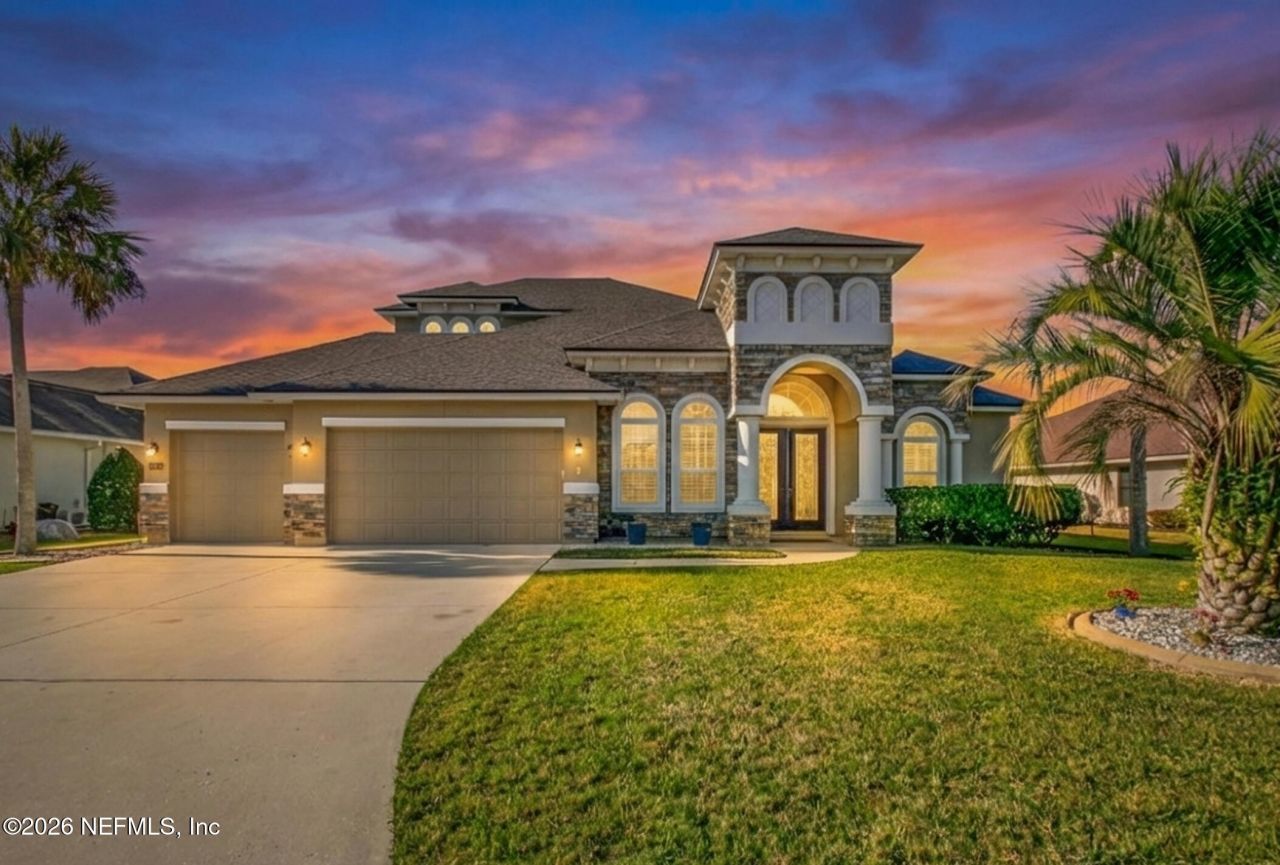 Leave the snow shovel behind and step into a lifestyle of permanent sunshine, tranquil lakefront views, and true independence. Set on a peaceful lake in St. Johns County, this exceptional estate is a masterclass in freedom living--pairing Florida's favorable tax advantages with the confidence of a high-efficiency, fully integrated solar power system designed for self-sufficiency. An assumable loan at 2.25% further enhances the appeal of this exceptional offering. Designed for those who believe life is best lived outdoors, the .35-acre lakefront sanctuary features a sprawling, fully fenced backyard--a private retreat where pets can roam freely while you enjoy a January morning swim in the shimmering saltwater pool. As the sun sets over the water, relax on the extended paver patio, unwind in the bubbling spa, and host unforgettable evenings in the full summer kitchen. Whether gathered around the propane fireplace in the covered lounge or watching the game on the outdoor TV, this self-sustaining resort quietly powers your lifestyle while nature provides the backdrop. Inside, the transition from recreation to rest is effortless. Architectural mastery takes center stage with soaring coffered ceilings and a custom stone fireplace anchoring the grand great room. The expansive floor plan offers remarkable versatility with six spacious bedrooms and four full baths, delivering the rare luxury of a home that adapts as your life evolves. Create multiple dedicated home offices, a private guest wing, a media room, or a personal fitness studio this residence flexes to meet your vision. From the five-star elegance of the Owner's Suite to the vibrant MuraBella community amenities just steps away, this is more than a move it's a permanent vacation. Don't let your dream of year-round summer belong to someone else. Schedule your private tour today and experience the peace, privacy, and independence you've been searching for. Night photo of the back grill area is AI-generated for visual effect.