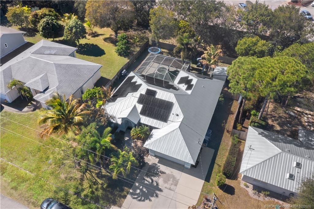 Great 3/2/2 one story CBS Single family home with a screened freeform pool. The floors are luxury vinyl, maple cabinets in the kitchen with granite countertops, new metal roof in 2024, a/c and h/w heater new in 2021, plantation shutters in the dining room, and a cabana bath convenient to the pool. This would be either a wonderful family or a retirement home. There is a play area in the backyard as well as a shed. The home is located in East Port St Lucie with easy access to shopping and restaurants as well as beautiful beaches. Hot tub heater does not work, nor does 1 stove burner or the barbecue in the outdoor kitchen and the refrigerator has a crack in the back.