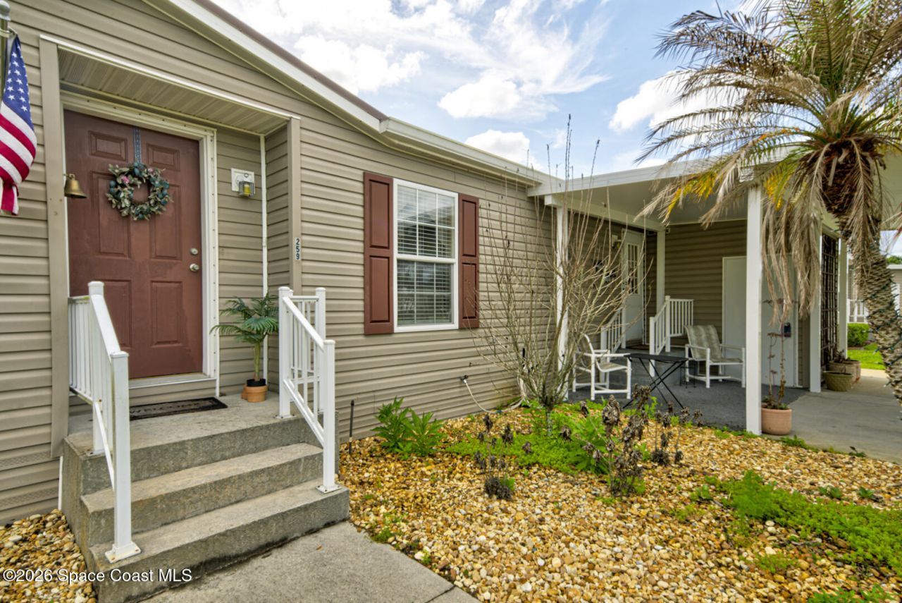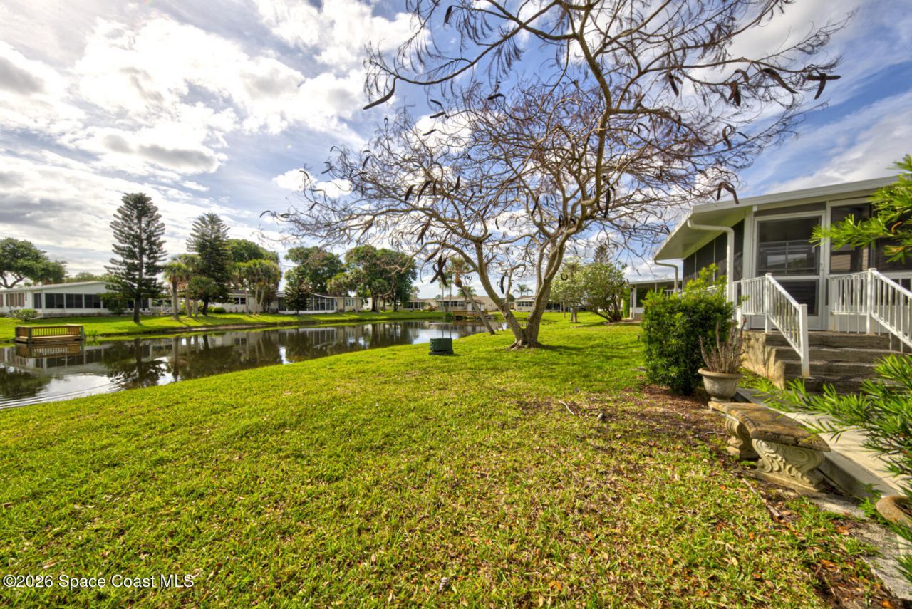 Waterfront living with unobstructed water views from your back patio, complete with a beautiful mature tree creating a peaceful backyard setting. This is also a perfect spot to watch rocket launches right from home. Inside, the inviting kitchen opens to a spacious living room filled with natural light and scenic water views. The home features a newer metal roof for added value and peace of mind. Located in a very active 55+ community offering fantastic amenities including a clubhouse, recreation room, library, full kitchen, exercise room, heated inground pool and spa, pickleball courts, and RV parking/storage. The low condo fee includes these amenities plus cable/internet, reclaimed water for lawn irrigation, and lawn care. Best of all, there is no lot rent--you own the land. Conveniently located about 20 minutes to the beach, 30 minutes to Orlando International Airport, and close to abundant shopping and dining in nearby Viera.