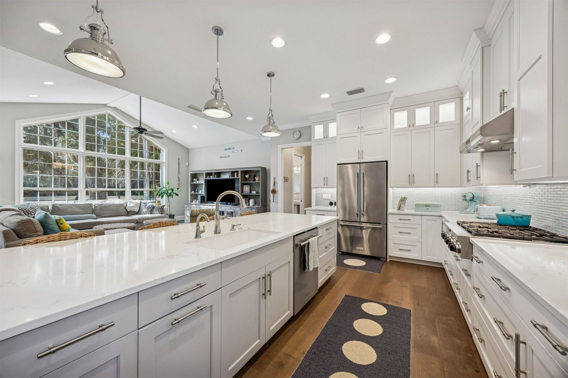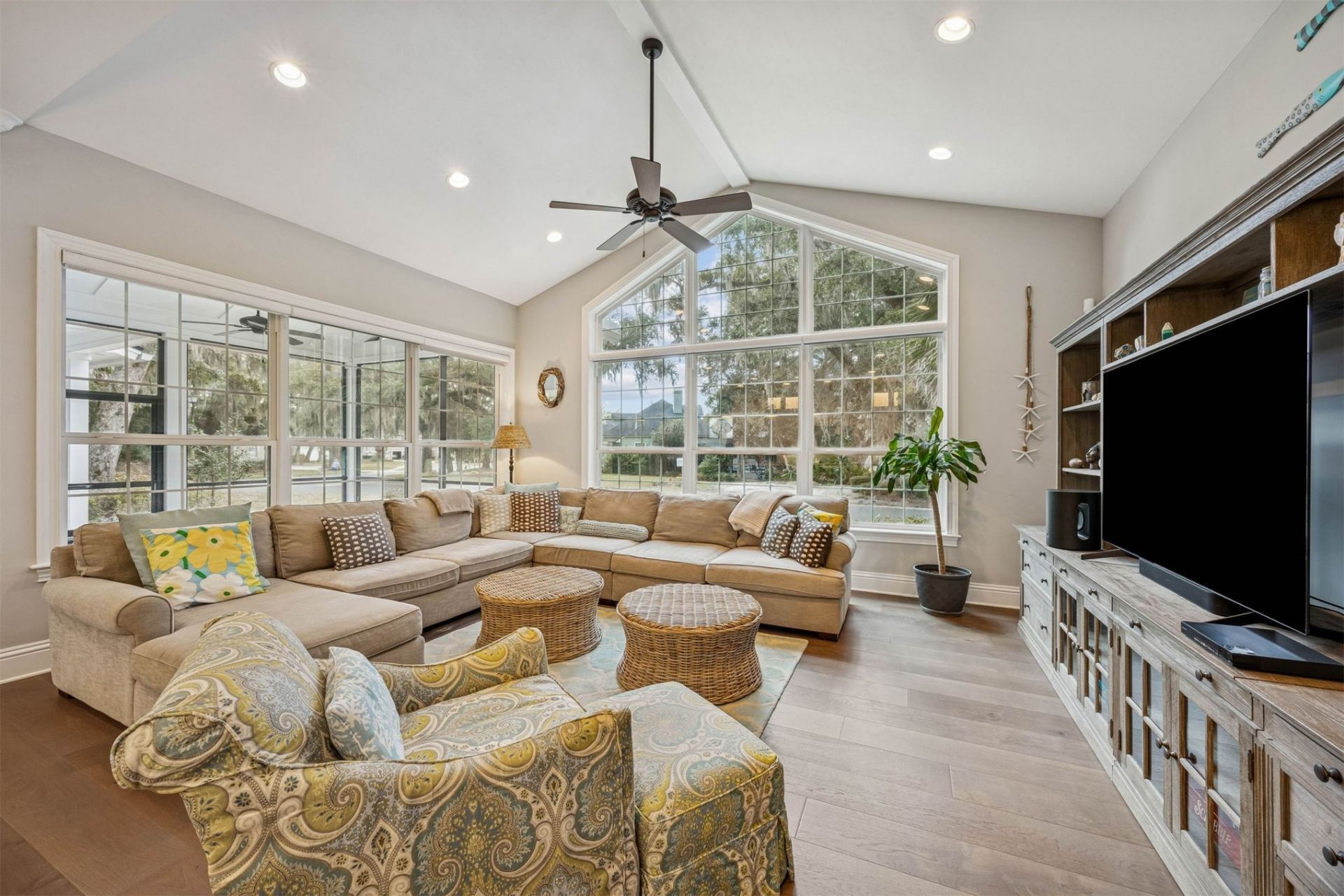 Custom coastal luxury on Amelia Island. Designed by architect John Dodd and built by Castleton Homes, this newer construction residence is privately positioned on a corner homesite beside a conservation lot with pond views and access to Egans Creek Greenway. Just minutes from Amelia Island beaches, Fort Clinch State Park, and historic downtown Fernandina Beach, this location offers the best of island living. Inside, elevated finishes and exceptional craftsmanship define the home, including 8 inch wire brushed white oak flooring throughout, 10 FT ceilings, a dramatic 13 FT cathedral ceiling in the family room, 8 FT solid core interior doors, crown molding, and designer details throughout. The chefs kitchen is beautiful and functional with quartz countertops, a 6 burner gas cooktop, oversized island, walk in pantry with solid wood shelving, reverse osmosis system, designer lighting, and ceiling height custom cabinetry with integrated lighting. A main level half bath adds convenience for guests and entertaining. The first floor owners suite offers privacy and comfort with a spa inspired bath, heated towel rack, and custom walk in closet. Additional bedrooms include en suite baths, and the loft provides flexible space for an office or quiet retreat. Abundant storage enhances everyday living. Outdoor spaces are designed for the Amelia Island lifestyle, with a screened covered porch for private evenings and a second floor rocking chair porch overlooking the pond. Paid off solar panels, 2 Tesla Powerwalls with no generator needed, and a Tesla wall charger add efficiency and peace of mind. Offered partially furnished. Rare newer construction near beaches, downtown Fernandina Beach, Fort Clinch, and Egans Creek Greenway.