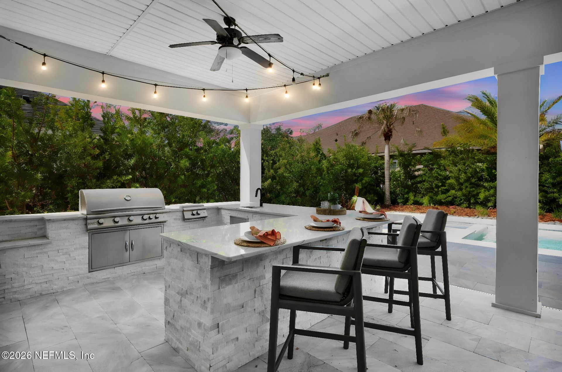 Say hello to the home that's about to steal your heart in The Outlook at Twenty Mile! This upgraded Zespedes floor plan brings major wow-factor and FUN with bright designer finishes and effortless livability. A grand two-story foyer opens to a light filled great room w/20-foot ceilings, a custom shiplap wall, cozy gas fireplace, and sliding doors that create a seamless indoor-outdoor vibe. The chef's kitchen impresses with a 12-foot quartz island, double-stacked cabinetry, farmhouse sink, gas cooktop, and butler's pantry, perfect for entertaining. With 5 bedrooms (the primary plus one secondary bedroom on the main level), 4.5 baths, a study, & loft, there's space for guests, work, & play! But the real showstopper is the backyard. This private retreat features a pool, spa, summer kitchen, putting green, and a covered outdoor living area. This space is made for cannonballs, cocktails, and everything in between. Tropical privacy landscaping makes this feel like your own vacation-at-home! A 3-car tandem garage gives you extra space for storage or your golf cart! Stylish, functional, and packed with personality. This is more than a home, it's a lifestyle and it's ready for its next lucky homeowner. All just a golf cart ride to Twenty Mile Park, top-rated schools, and Nocatee amenities. Award-winning Nocatee community offers multiple parks, miles of scenic nature trails, kayak/paddleboard access at the Intracoastal Waterway, pickleball and tennis courts, basketball courts, playgrounds, splash parks, and the popular Waterpark & Spraygrounds. Residents also enjoy year-round community events, local shops and dining at Nocatee Town Center, and close proximity to A-rated schools.