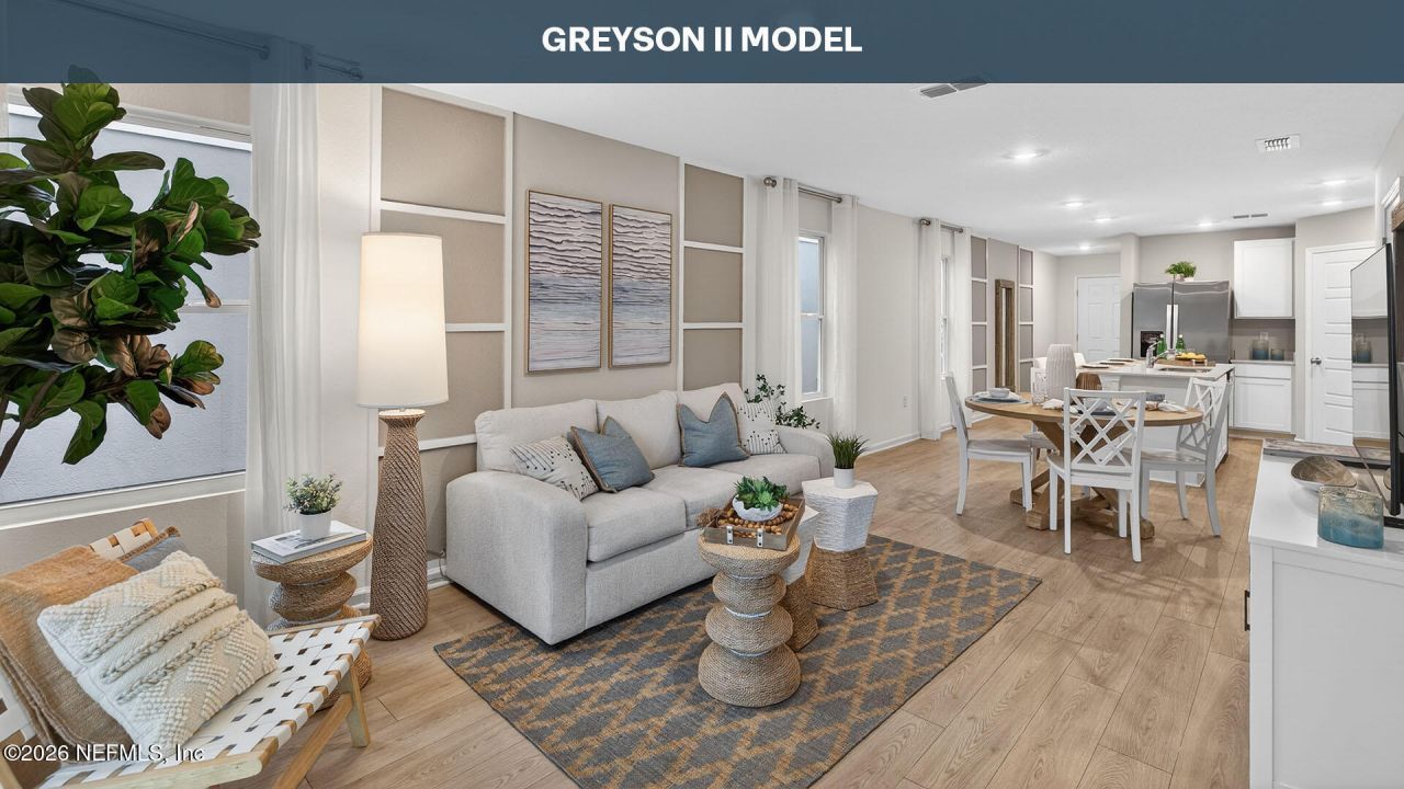 Step into the Greyson II, a beautifully designed villa that maximizes space and comfort. With approximately 1,373 square feet, this three-bedroom, 2.5-bathroom home offers the perfect blend of style and functionality. The open-concept layout creates a seamless flow between the spacious kitchen, dining area, and gathering room-ideal for entertaining family and friends. The large kitchen bar serves as the heart of the home, making meal prep both easy and enjoyable. Abundant natural light from sliding doors brightens the entire space, creating a warm and inviting atmosphere. Upstairs, the primary suite is a true retreat, featuring a spacious bathroom, a vanity, and a large walk-in closet. Conveniently located upstairs laundry adds to the home's practicality. The Greyson II isn't just a home-it's a smart investment. With energy-efficient features and thoughtful design, this stunning new construction villa is available in desirable neighborhoods across North Florida.