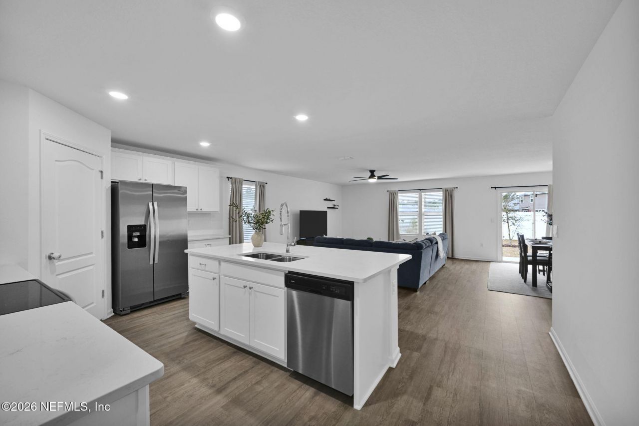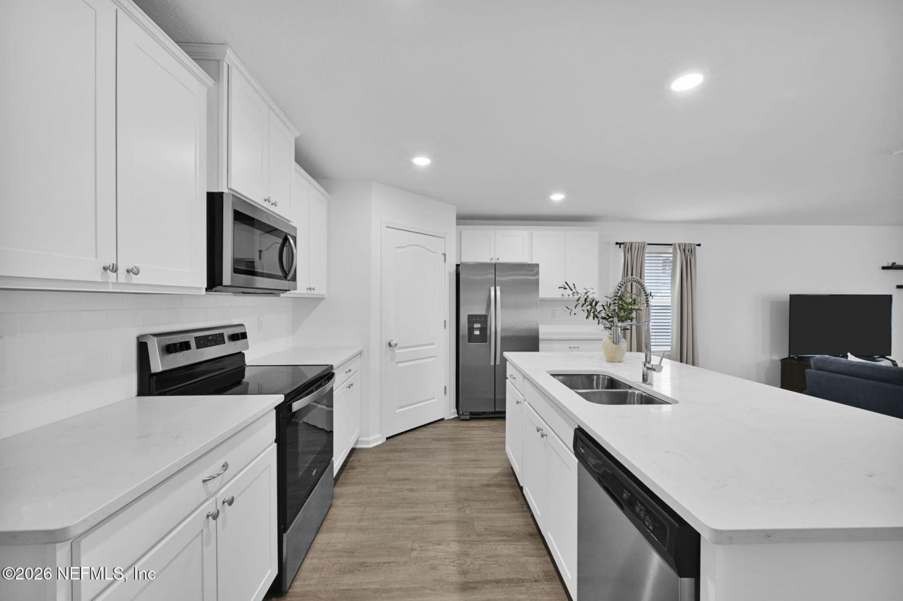 This gorgeous home already has everything done, so you can move right in! The kitchen features quartz countertops, tile backsplash, and premium white cabinetry with 36'' uppers and crown molding. Quartz countertops in both bathrooms create a consistent, modern style throughout the home. You'll notice right away there's NO carpet anywhere - just durable luxury vinyl plank flooring throughout, giving the home a seamless, low-maintenance feel. The stainless steel refrigerator, washer and dryer are all included, so you can move in without a long to-do list. What really sets this property apart is what's already been added: gutters, vinyl privacy fencing, water softener, blinds, alarm system, pantry built-ins, termite protection, and an upgraded heat detector. Located in Cross Creek, you're zoned for Clay County's top-rated schools and just minutes from Fleming Island's everyday shopping and dining. Naval Air Station Jacksonville is approximately a 25-minute drive, making commuting straightforward. The community's resort style amenity center includes a clubhouse, pool, fitness center, and sports courts, adding extra space to unwind or stay active close to home!