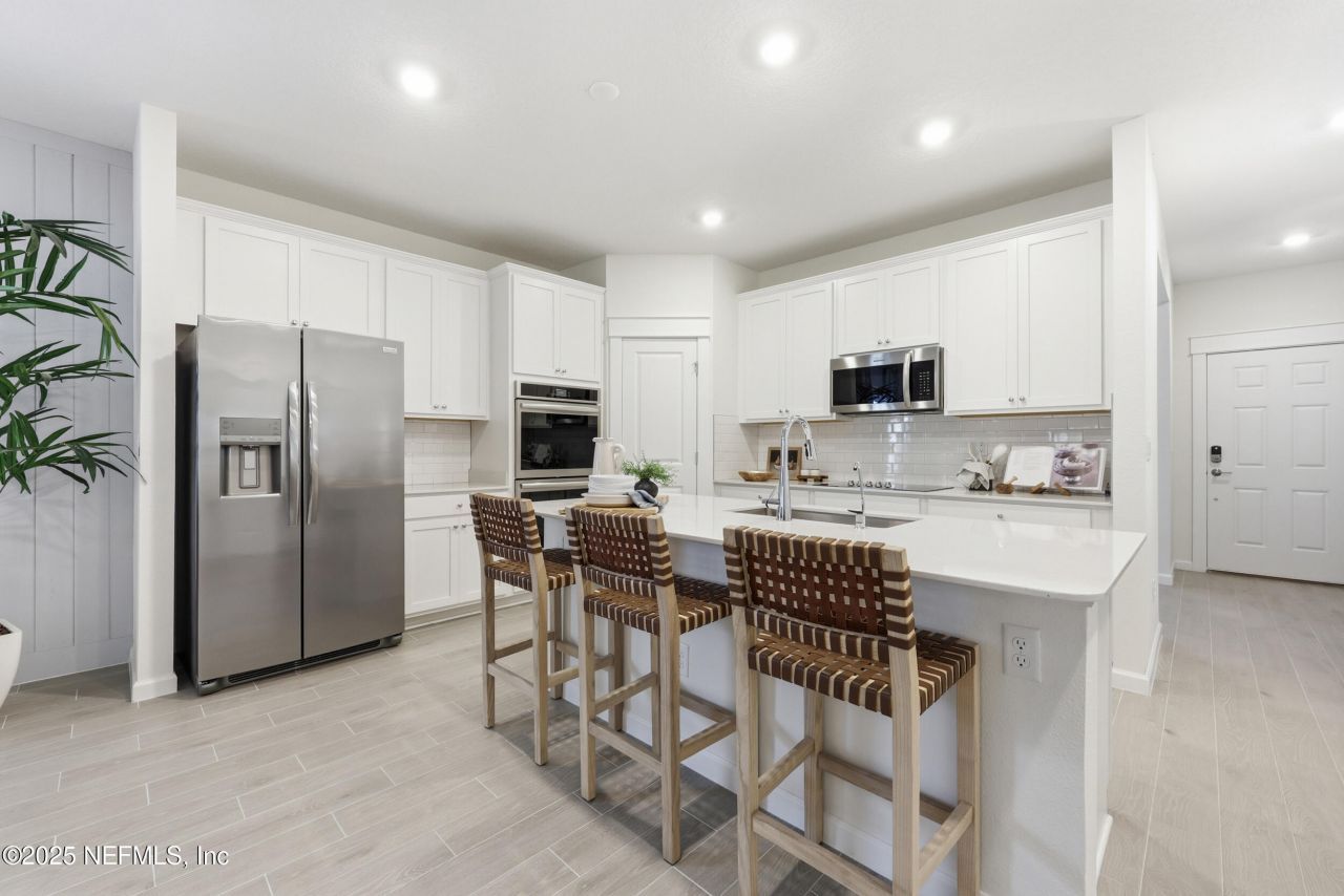 55+ Active Adult New Construction Model Home featuring the Sierra II floor plan with 4 bedrooms, 2.5 baths, flex/den, & 2-car garage. This beautifully designed home offers a paver driveway & entry, wood look tile throughout (no carpet), crown molding, blinds, and designer gold-tone lighting. The flex space highlights a slatted wood ceiling, with wood panel accents extending into the entryway. The gourmet kitchen features white cabinetry, white quartz countertops, double wall ovens, 5 burner electric cooktop, stainless refrigerator & sink, + walk-in pantry. The open living & dining area includes a slat-wood accent wall and flows to the screened paver lanai through 2-panel sliders with preserve views. Guest bedrooms offer custom molding & panel details, plus a full bath with walk-in shower + a separate half bath. The primary suite features wood panel detailing, gold fixtures, a large walk-in closet, dual sinks, & upgraded shower. Up to $3,000 lender credit available w/ preferred lender