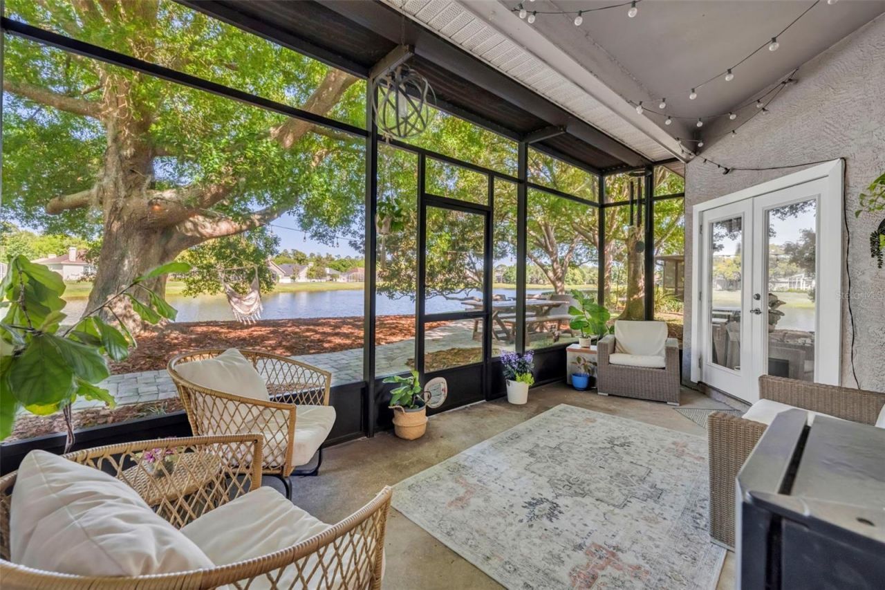Tucked beneath a canopy of mature trees and set along the water, this inviting retreat offers the peaceful, 'at home feeling you have been searching for. From the moment you arrive, you will appreciate the tranquil setting, where winding paver walkways lead to beautifully designed outdoor living spaces overlooking the lake. Enjoy dining beneath the shade of the trees at the picnic table, evenings gathered around the firepit seating area, and quiet mornings in the hanging chair or on the screened back porch taking in the water views. String lights overhead and the natural surroundings create the perfect setting for grilling, entertaining, or simply unwinding. Inside, the home is warm, welcoming, and filled with natural light. Two separate living spaces provide flexibility for everyday living, entertaining, a playroom, or even a home office. The main living room features soaring ceilings, a cozy fireplace with custom wood mantel and built-in shelving, and peaceful views of the backyard and water beyond. French doors lead directly to the screened porch, seamlessly blending indoor and outdoor living. The updated eat-in kitchen is truly the heart of the home, featuring gorgeous countertops, white cabinetry, stainless steel appliances, abundant storage, and a center island perfect for gathering with family and friends. The kitchen opens easily to the living areas, making the layout both functional and inviting. The nicely sized primary suite offers a relaxing retreat with a walk-in shower and separate soaking tub, while the guest bathroom has been tastefully updated. An inside laundry room with washer and dryer adds even more convenience. Ideally located within walking distance of Carillon Elementary School and Paul J. Hagerty High School, and just minutes from University of Central Florida, Siemens, Central Florida Research Park, and Twin Rivers Golf Club, this property combines a quiet, tucked-away feel with an incredibly convenient location. *Roof 2023