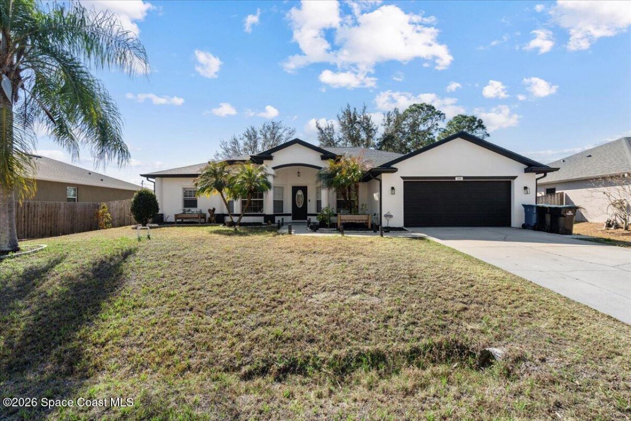Fully remodeled 5BR/2BA home in Palm Bay with **NO HOA!** Major 2025 upgrades include a new roof, HVAC, water heater, and septic pump for peace of mind. This split floorplan offers privacy plus **two spacious living areas**, perfect for flexible living. Interior features ceramic tile and LVP flooring throughout. The oversized kitchen boasts white shaker cabinets, quartz countertops, stainless smart appliances, and a huge center island ideal for gathering. A whole-house water treatment system is included. The expansive primary suite features two walk-in closets, a walk-in shower, and a jetted tub. Enjoy a fully fenced backyard with a grill area and fire pit?ready for entertaining.