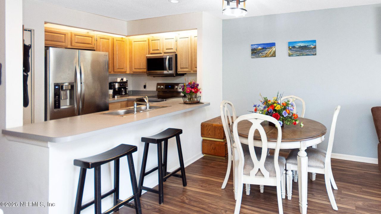 Great Home! Great Neighborhood! Charming 2BR/2.5BA upgraded townhome w/attached garage & spacious waterfront deck. Open floor plan w/breakfast bar, extra wide sliding glass doors to deck, skylight, recessed lighting, ceiling fans, showcase stairway, wood burning corner fireplace & office space in foyer. Highly desirable 2nd flr split bedroom design features 2 bedrooms each with its own private bathroom. Primary suite overlooks the water & features an ensuite bath, vaulted ceiling, ceiling fan & 2 Walk In Closets. Over $10,000 in NEW upgrades incl: gorgeous Luxury Vinyl Plank floors, designer tile in baths, light fixtures & ceiling fans throughout, dishwasher, freshly painted & sealed deck. Southern exposure & skylight provide loads of natural light. Roof only 4 years old. The Moorings is a quiet, pet & kid friendly, waterfront community close to A rated schools & daycare, shops, restaurants & I295. The LOWEST HOA dues in town, only $90 per month!