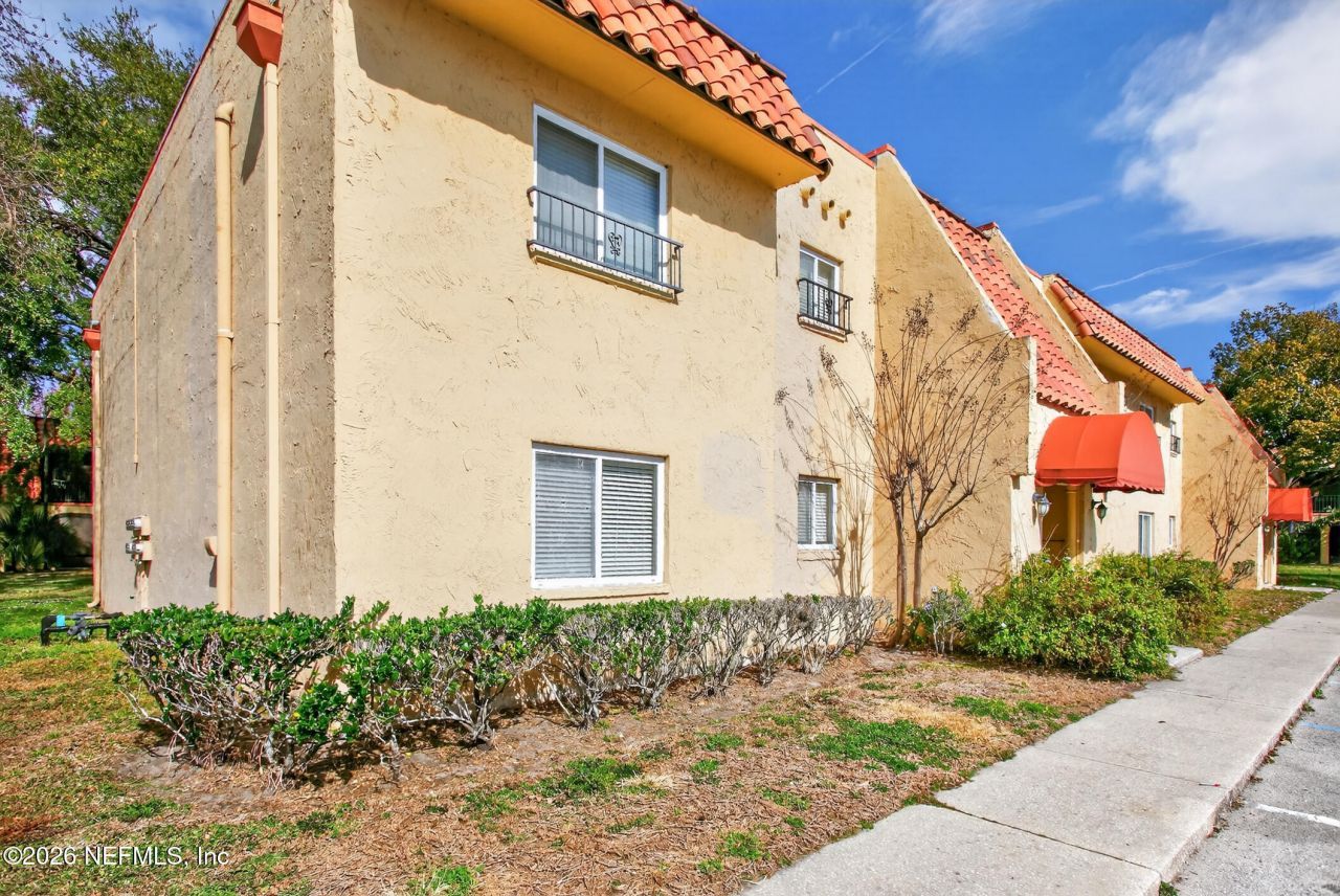 Perfect for an owner occupant or investor! Welcome to effortless living in this charming ground-floor, end unit condo at The Colony at San Jose. An ideal living space without a single step to climb. This 2-bedroom, 2-bathroom residence combines privacy with convenience, featuring a bright and airy living room that flows seamlessly into the dining area. The kitchen highlights a charming tray ceiling, crisp white cabinetry, white appliances, and tiled floors for easy maintenance. The generously sized primary bedroom will be your oasis after a long day, also includes an en-suite bath and a walk-in closet. Classic French doors open from the living area onto your private, covered ground-floor patio, an ideal spot for relaxation overlooking the lush courtyard grounds. Residents of this gated community enjoy resort-style amenities, including a 24-hour guard gate, indoor heated pool, outdoor pool, and fitness center, all located just minutes from San Jose Blvd and The Bolles School.