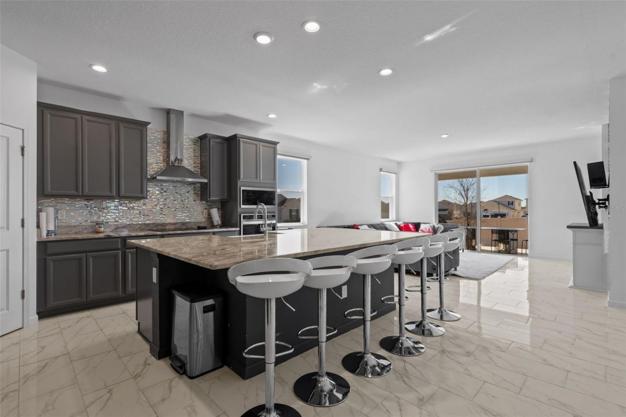 Move-in-ready 5-bedroom, 3.5-bath home located in HARTWOOD LNDG, featuring great curb appeal, a paver driveway, and a welcoming covered front porch. Inside, enjoy a bright open-concept layout with oversized tile flooring, recessed lighting, and a spacious living area that flows seamlessly into the kitchen-perfect for entertaining. The chef-style kitchen offers a large granite island with bar seating, gray cabinetry, stainless-steel appliances, designer backsplash, and built-in oven/microwave. Sliding glass doors lead to a covered lanai and a fully fenced backyard for privacy and outdoor enjoyment. Upstairs includes a generous loft/bonus room ideal for a media room, playroom, or second living space. The primary suite is spacious with a modern accent wall and an en-suite bath with dual sinks, granite counters, and a glass-enclosed shower. Dedicated laundry room included. Plus, a converted garage game room adds extra space for fun and entertaining.
