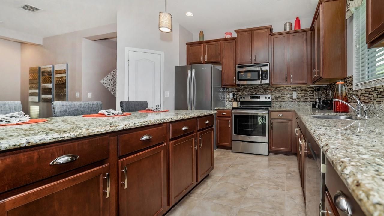 Beautiful home in gated community, residents have access to a pier on Lake Davenport, the clubhouse, swimming pool, and tennis court. This beautiful 4 bed/2 bath home features landscaping, pavers, a two car garage and a big backyard. Inside you'll find modern finishes, spotless tile floors and natural light. The gourmet kitchen presents stainless steel appliances, a center island with bar top seating, granite countertops, modern backsplash, pantry space and an eat in area that leads out to the covered lanai. The indoor laundry room has a cabinet storage and a Samsung washer and dryer. Minutes away from Southern Dunes Golf Course, Manny's Chophouse, Walmart, Winn Dixie, Hwy 27, 17 92, I4, Haines City, Lake Eva Community Park, and just 30 minute drive away from Disney World and the theme parks.