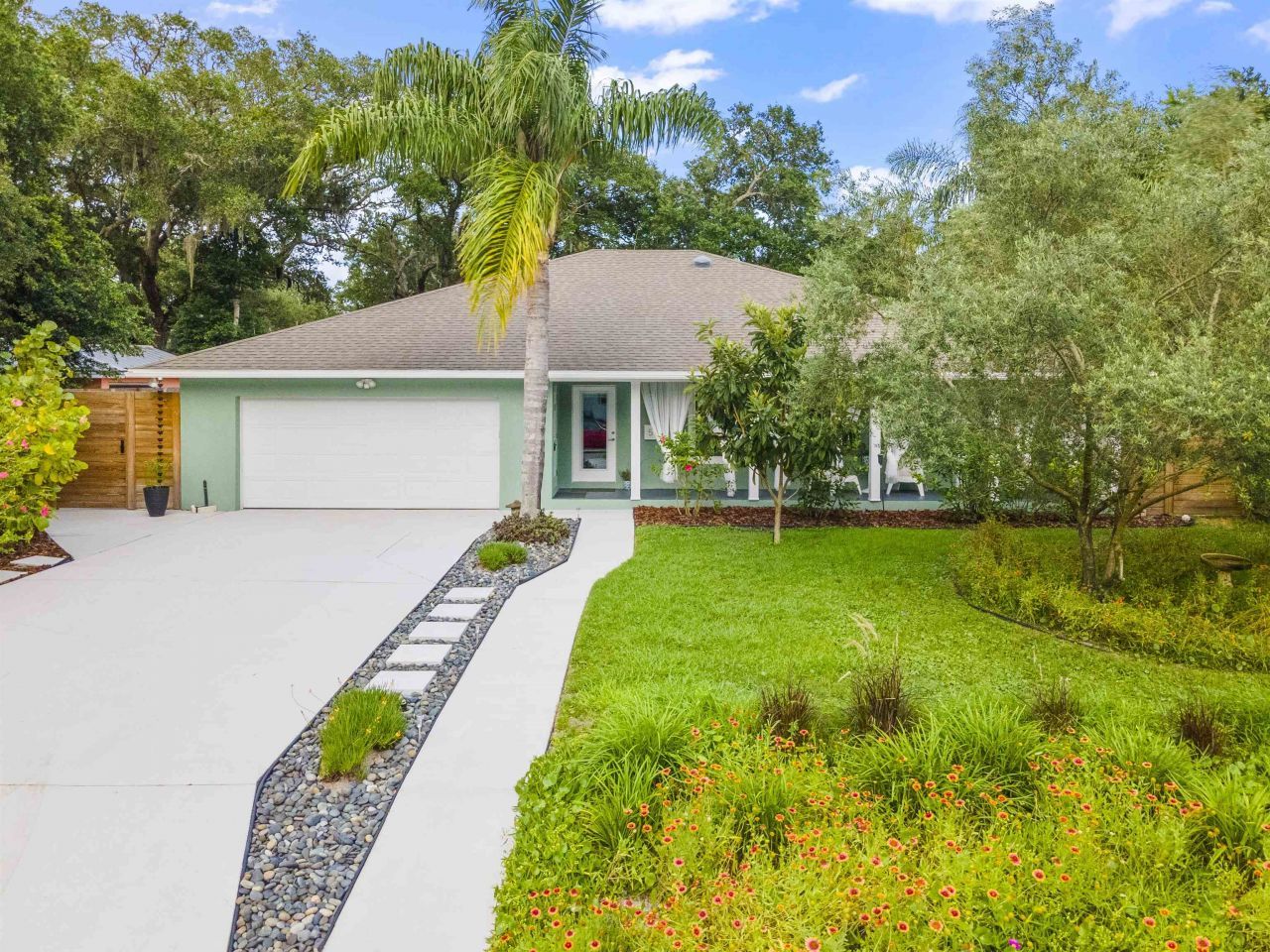 REDUCED - 3-bedroom, 3 Full bath concrete block home in the much sought after Woodland Subdivision (St. Augustine Beach) with no HOA. If you are looking for beach living, look no further. This beautiful modern home welcomes you with a stunning display of native plants, flowers, trees, modern landscaping, and majestic palm trees. Enjoy the professionally landscaped gardens, easy clean concrete patio and back deck for entertaining with friends. This spacious home has over 2,000 sq feet of living space with abundant natural light from 5 solar tubes. It is all one level with no stairs. Freshly painted inside and out, newer Energy Star vinyl windows. Bring your pets as it has a customed designed 8-foot-tall modern fence with duo access gates for privacy and wraps around the entire back yard. Back deck offers plenty of space for entertaining and newly added power outlets. Beach access, YMCA, Beach Pier, restaurants, Anastasia State Park and Ron Parker Park with pickleball, tennis and playground are all within walking distance. The beach access at the end of Pope Rd is vehicle free. The HVAC is under a transferable maintenance program and the condenser fan motor was replaced 6/5/2025. No flood insurance is required as it is in Flood Zone X. This home is equipped with a full set of hurricane fabric panels for ease of mind during hurricane season. Rain Bird irrigation sprinkler system with wireless rain/frost sensor and privately owned pump and drip lines hooked up to a shared artesian well. The garage is equipped with a 240 amp outlet which can be used for your electric vehicle charger, welder, freezer, or specialty woodworking power tools. There are too many features to mention. Please look under "documents"? for additional features or I can email them to you. There is an assumable VA loan with a very attractive interest rate.