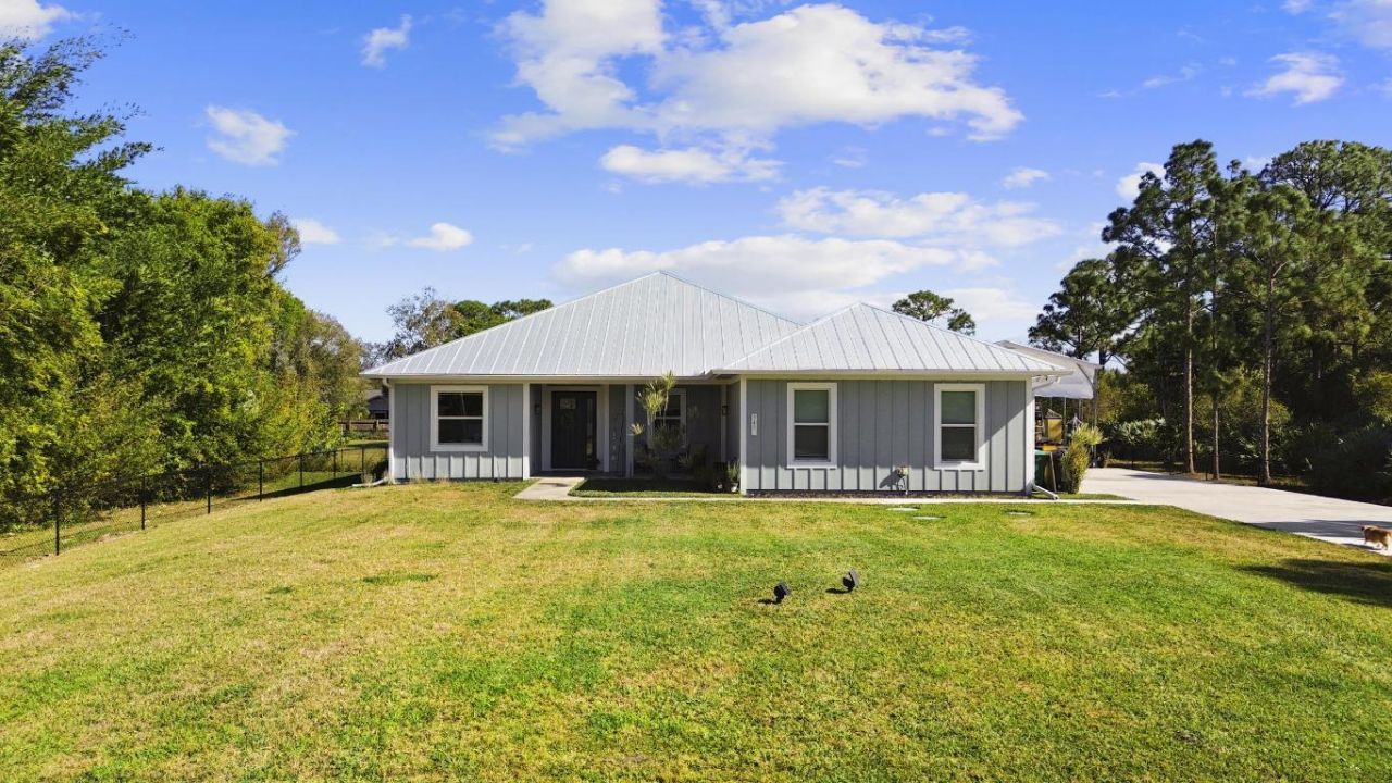 WELCOME HOME. This well-appointed 2022 build gem resting on a premium .68-acre lotand boasting 3 bedrooms, 2 bathrooms, oversized 3 car attached garage with epoxy flooring saltwater pool, Bullfrog Spa, upgrades and designer touches galore, hurricane impact windows and doors throughout, metal roof, 250-gallon propane tank, solar pool system, a massive 18X150 concrete drive leads to a 14hx18w30w steel carport perfect for boat or RV storage. In addition, a full beautiful powder coated black chain link fence encloses the entire .68 acres to include electric gate. The grounds are irrigated by a 12-zone rain bird system. The back yard includes a 12X30 permitted building complete with metal roof, gutters electric, windows, entrance door, utility roll up door to include a 12X30 sitting porch Upon entering this beautiful split floor plan you have a beautiful view of the massive outdoor space to include the saltwater solar heated pool and massive screened outdoor space. The kitchen is a chefs dream to include a 48double electric oven dual range with gas cook top, pot filler, and range hood vented to exterior, 42 white custom soft close cabinets, pullouts galore, pantry, black stainless-steel appliances, under the counter microwave. The kitchen island is oversized for a large family or entertainers delight. To make entertaining a breeze a 2025 custom built in buffet with 11X24 buffet with pull out storage, local live edge countertop. The living area is bright an airy as it opens to lanai and pool it. The living area includes a gorgeous slate fireplace floor to ceiling with live edge mantel and hearth. The fireplace is flanked by solid cherry wood lighted cases locally handcrafted. Relax in your primary suite with private access to the solar heated pool/spa, his and hers walk in closets 6X5 and 5X11. The beautiful well-appointed en-suite bathroom boasts dual sinks, custom lighting, white cabinets with shite marble countertops and a walk in 5X6 shower spa. There are two additional bedrooms with one offering a murphy bed flanked by built in floor to ceiling shelving. A laundry room, solid wood cabinet storage, mud room is off the garage. This home needs nothing and is move in ready. WELCOME HOME!!