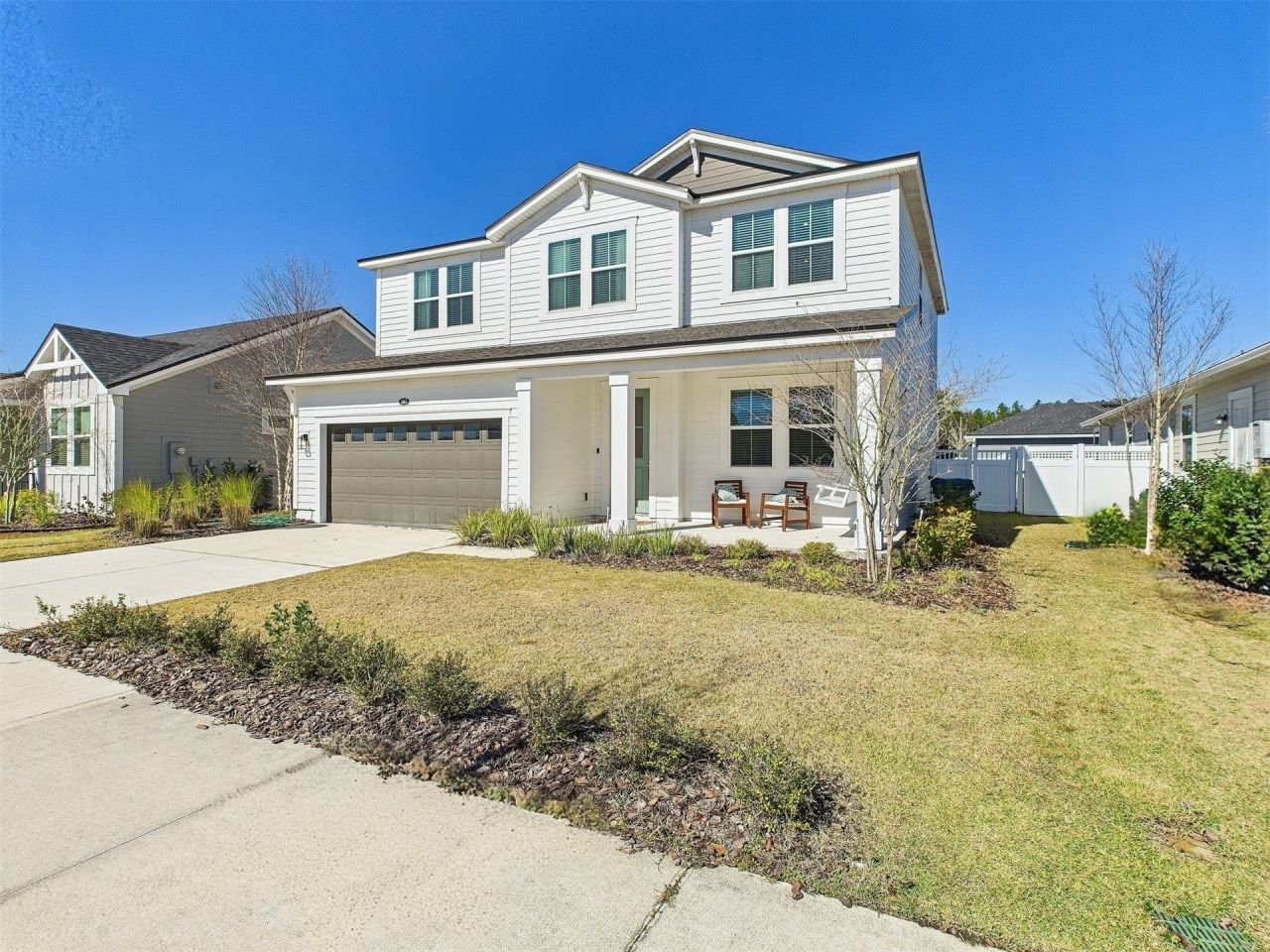 Why wait for new construction when this move-in-ready home is available now? Located in the golf cart-friendly Wildlight community, this beautifully upgraded home offers style and comfort with inviting front-porch living. The bright, open floor plan features a dedicated office just off the entry. The chefs kitchen includes stainless steel natural gas appliances, a large center island, quartz countertops, and an abundance of cabinets, flowing into the family room with a shiplap accent wall and cozy built-in fireplace. Upstairs offers a spacious loft and a primary suite with a tray ceiling and spa-like bath featuring double sinks, a garden tub, walk-in shower, and walk-in closet. Three additional bedrooms, a full bath, and utility room complete the home. Enjoy the oversized, fully fenced backyard with room for a pool. Walking distance to Wildlight Elementary, community pool, parks, and a scenic lake with dock. Convenient access to Kings Bay and Mayport Naval Base, Amelia Island, UF Health, Publix, and Jacksonville International Airport.