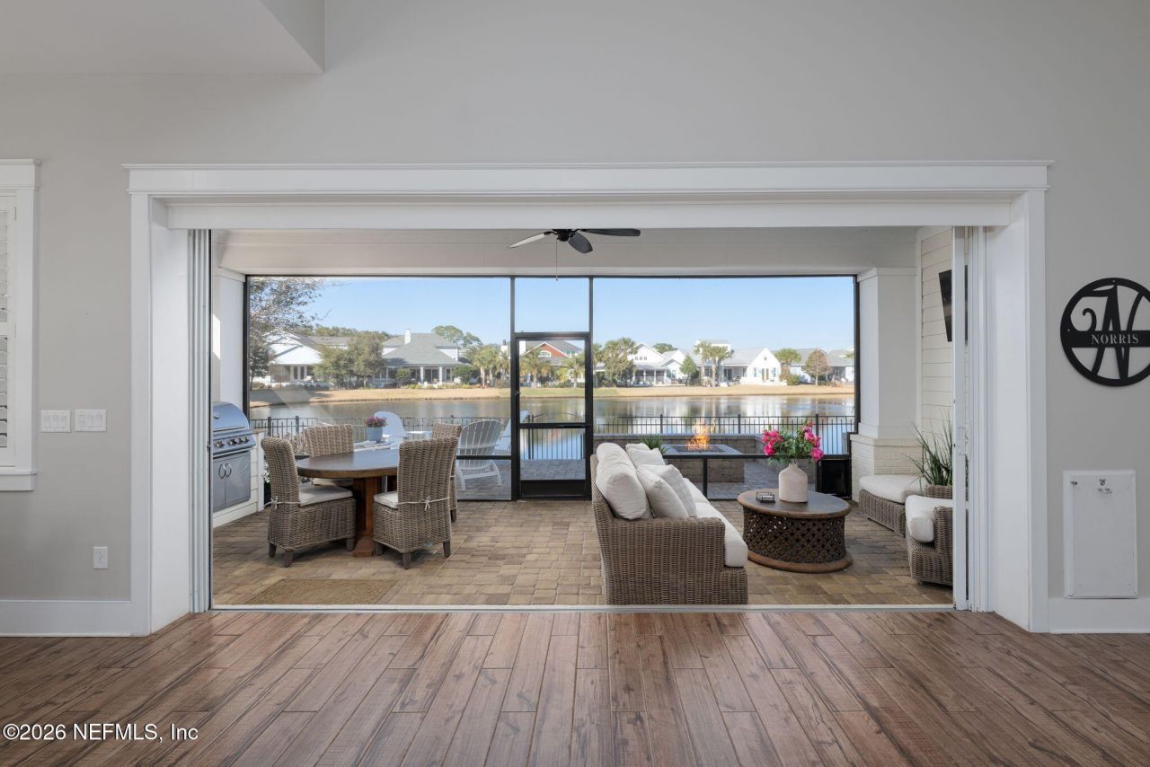 Enjoy easy, low-maintenance beach life in this rare *single-story* gem in Atlantic Beach Country Club! This 3BR/3BA open-concept home features a coffered 12' living room ceiling with wood paneled walls, panoramic sliding glass doors, and seamless indoor-outdoor Florida living. Thoughtfully designed with a dedicated office, abundant closets & smart upgrades like motorized garage lift storage, plantation shutters & a generator! Entertain with ease on the covered and screened back porch with summer kitchen, gather around the built-in fire pit, and unwind with peaceful lake views - your own private coastal retreat. Life is better when you live ~0.3 miles from the clubhouse, only 8 blocks to the beach (~0.8 miles) & moments from Beaches Town Center via bike or golf cart for coffee/lunch/shopping/you name it! SKIP THE WAIT LIST & enjoy immediate access to ABCC with fitness center, heated pool + vibrant dining & event calendar. Homeowners' Social Membership included. Golf/Racquet are upgrade