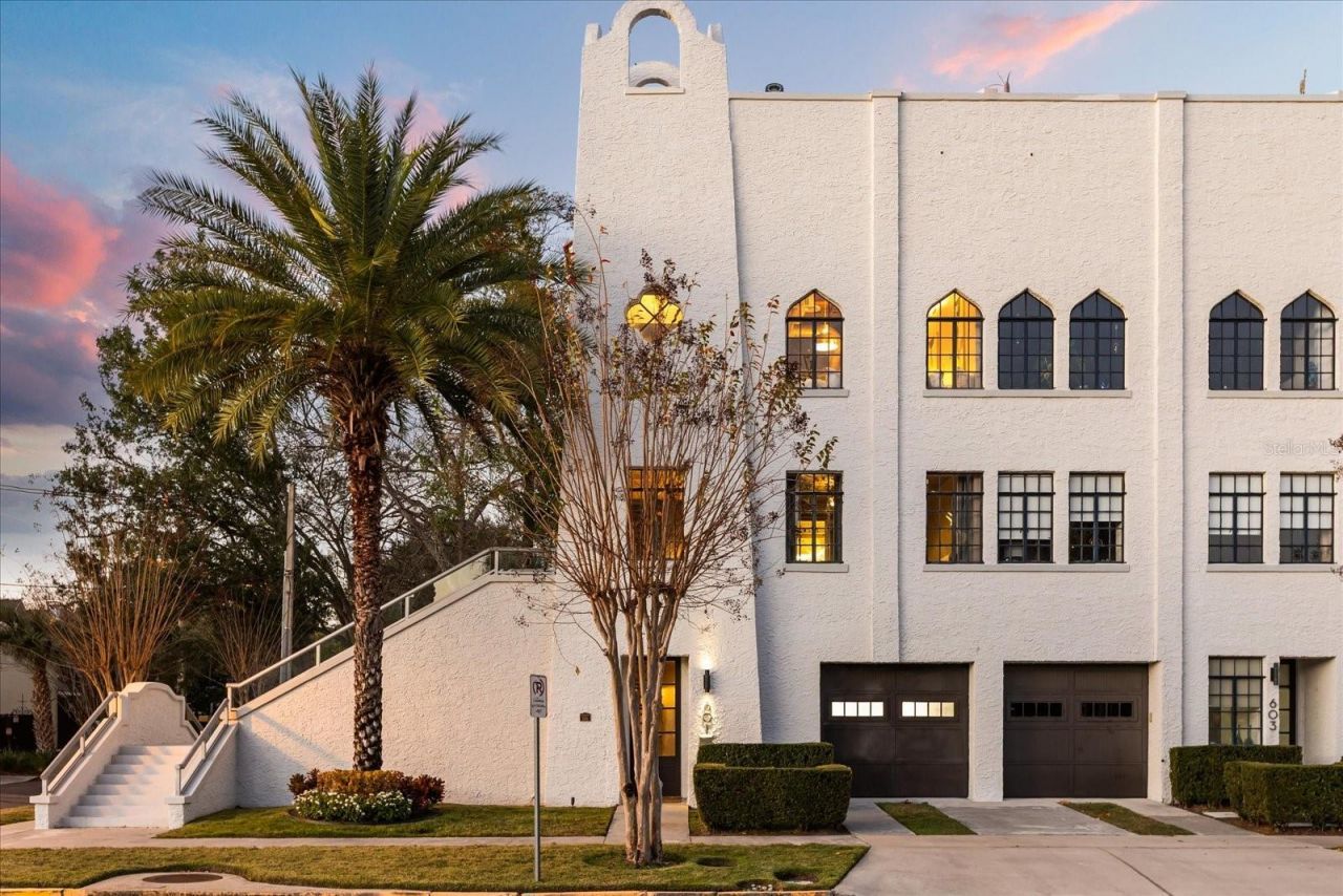 Just one block from Lake Eola Park in the heart of Downtown Orlando, this one-of-a-kind residence offers the rare opportunity to own a true piece of the city's history. Originally built as a mission-style church in 1928, the building has been thoughtfully reimagined into a limited collection of five architecturally distinct townhomes known as The Revival.This end-unit home stands apart, with a dramatic exterior staircase leading to the original church doors, serving as a striking architectural reminder of the building's past. Blending historic character with contemporary design in a way that feels both intentional and timeless. A private elevator connects all 4 levels of the residence, setting the tone for how seamlessly and thoughtfully the home lives from the moment you arrive.Original architectural elements-exposed brick, soaring cathedral ceilings, warm wood beams, and antique pointed steel-cased windows-tell the story of the building's past, while designer finishes, curated lighting, and modern upgrades elevate the space for today's lifestyle. The result is layered, refined, and unlike anything else in Downtown Orlando.The first level welcomes you with a charming entry and mudroom, along with direct access to a private backyard patio. This level also includes a flexible bedroom suite, ideal for guests or a private office, complete with its own en-suite bath and separate entrance.On the second floor, two additional en-suite bedrooms provide comfort and privacy, including a spacious primary suite featuring a beautifully appointed bath, generous counter space, and a walk-in closet with custom built-ins.The third floor anchors the home with an open-concept kitchen, featuring a substantial island with breakfast bar, seamlessly blending into the dining and living areas for effortless entertaining. A dramatic spiral staircase leads to a lofted overlook, perfect for a home office or second living area, with stairs up to a wet bar with access to the rooftop terrace, where panoramic Downtown Orlando skyline views create a truly unforgettable backdrop.From morning light streaming through historic windows to evenings spent watching Lake Eola's fireworks from above the city, this is a home meant to be experienced-not just seen. Unforgettable sunsets, glowing city lights, and seasonal celebrations become part of everyday life here.Additional features include a large laundry room with ample storage, and a tandem two-car garage.This residence offers walkable access to dining, shopping, entertainment and cultural destinations-while delivering a living experience that is truly rare. This is not simply a home, but a thoughtfully reimagined piece of Orlando history. Come experience it for yourself. You won't be disappointed!