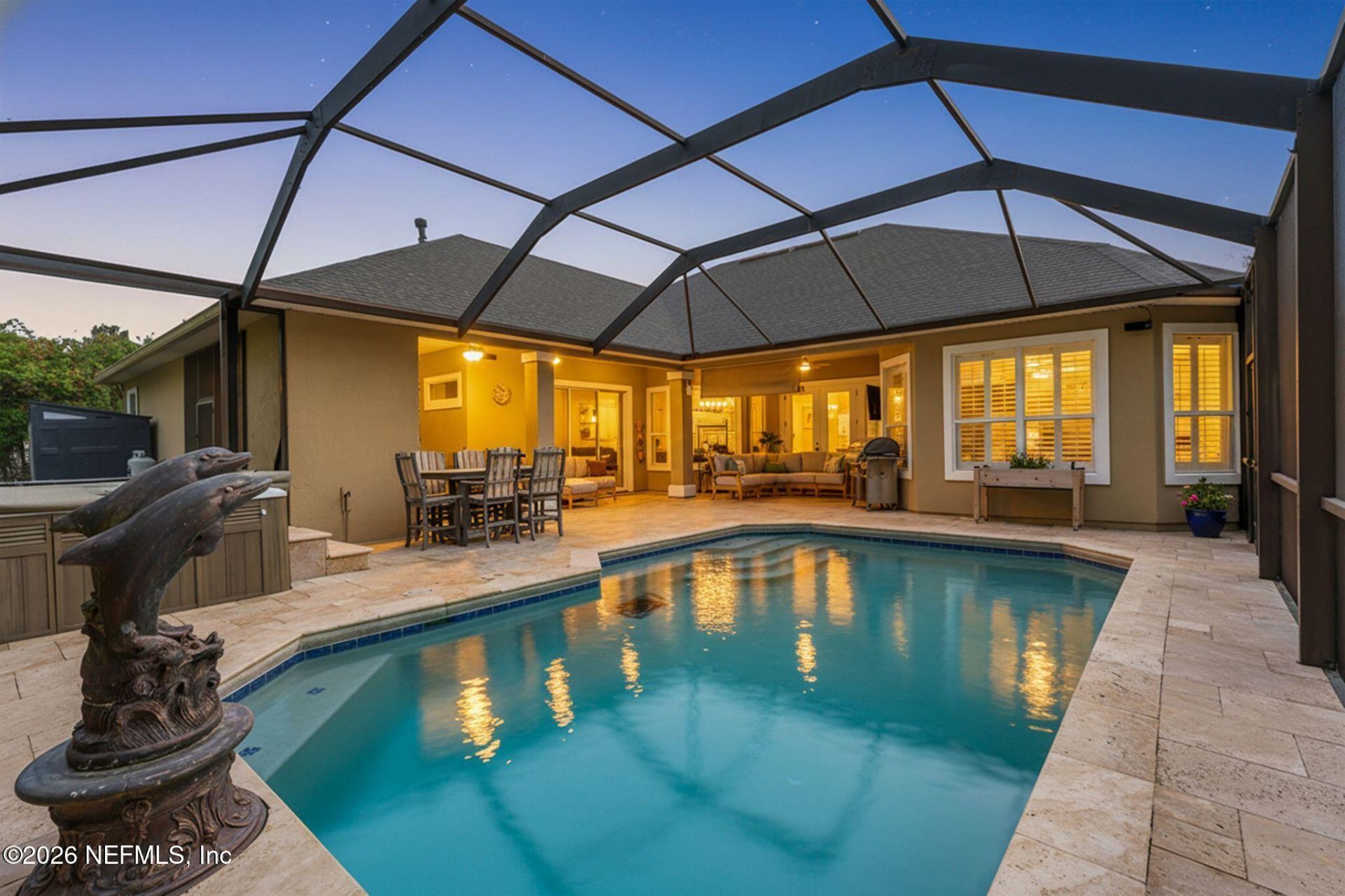 Welcome to Kensington, a desirable community with no CDD fees and a low HOA, where tree-lined streets lead to this exceptional .89-acre preserve homesite. An expansive driveway and 3-car garage set the tone as you step inside to soaring 12-foot ceilings, large-format designer tile flooring, and a bright yet inviting interior. A private office and flexible space flank the entry. The family room opens through French doors to a beautiful pool, hot tub, and covered lanai with outdoor fireplace. The exquisite kitchen features top-of-the-line appliances and elevated finishes, flowing into a warm living room with fireplace. A split floor plan offers 4 bedrooms and 3 baths with in-law potential. Enjoy ample green space and a peaceful preserve backdrop. Roof 2022, AC 2020. Buyer to verify all information. Does Not Convey-Lift stations, cabinets and organizational racks in garage, TV Mount in living room, Fridge in garage and mini-fridge on patio. Transferrable Termite Bond.