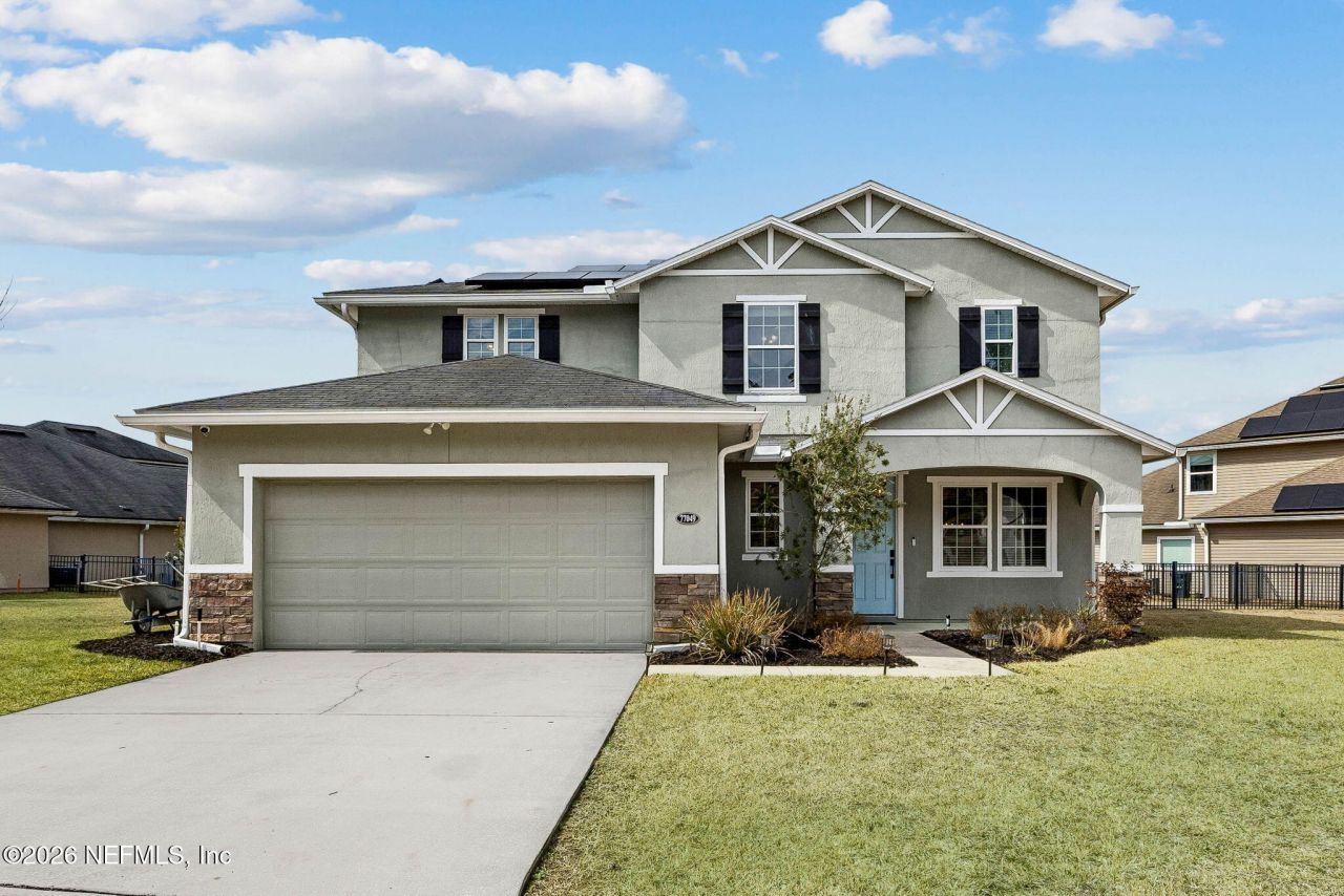Welcome to 77049 Andora Drive in Yulee a spacious 4-bedroom, 2.5-bath home perfectly positioned on an oversized lot with serene lake and fountain views. From the moment you enter, you're greeted by tile flooring that flows throughout the main living areas. To the left of the foyer is a convenient half bath, while to the right you'll find a formal dining room ideal for gatherings and holiday meals. Down the entry hall, the home opens into a generous family room that seamlessly connects to the large kitchen and eat-in area creating the perfect space for everyday living and entertaining. The kitchen is thoughtfully designed with granite countertops, rich wood cabinetry, stainless steel appliances, an oversized island, and even a built-in ice maker. Just off the breakfast area, sliding glass doors lead to a screened-in porch overlooking the fully fenced backyard, tranquil lake, and fountain a peaceful backdrop for morning coffee or evening relaxation. Off the kitchen, you'll also find a well-appointed laundry room complete with a utility sink and direct access to the garage. The staircase is conveniently located nearby, leading you upstairs where all four bedrooms are situated. Upstairs features luxury vinyl plank flooring throughout. One secondary bedroom includes charming built-in bookshelves and a cozy window seat. The guest bathroom is centrally located, and the spacious primary suite offers comfort and privacy, making it a true retreat. The neighborhood offers an amenity center with a pool, playground, and basketball court. This home is located near shopping, dining, and everyday conveniences, with quick access to the highway and Jacksonville International Airport. It is also equipped with solar panels, providing added energy efficiency and long-term savings. With its thoughtful layout, beautiful water views, and convenient location, this home offers the perfect blend of comfort, functionality, and lifestyle.