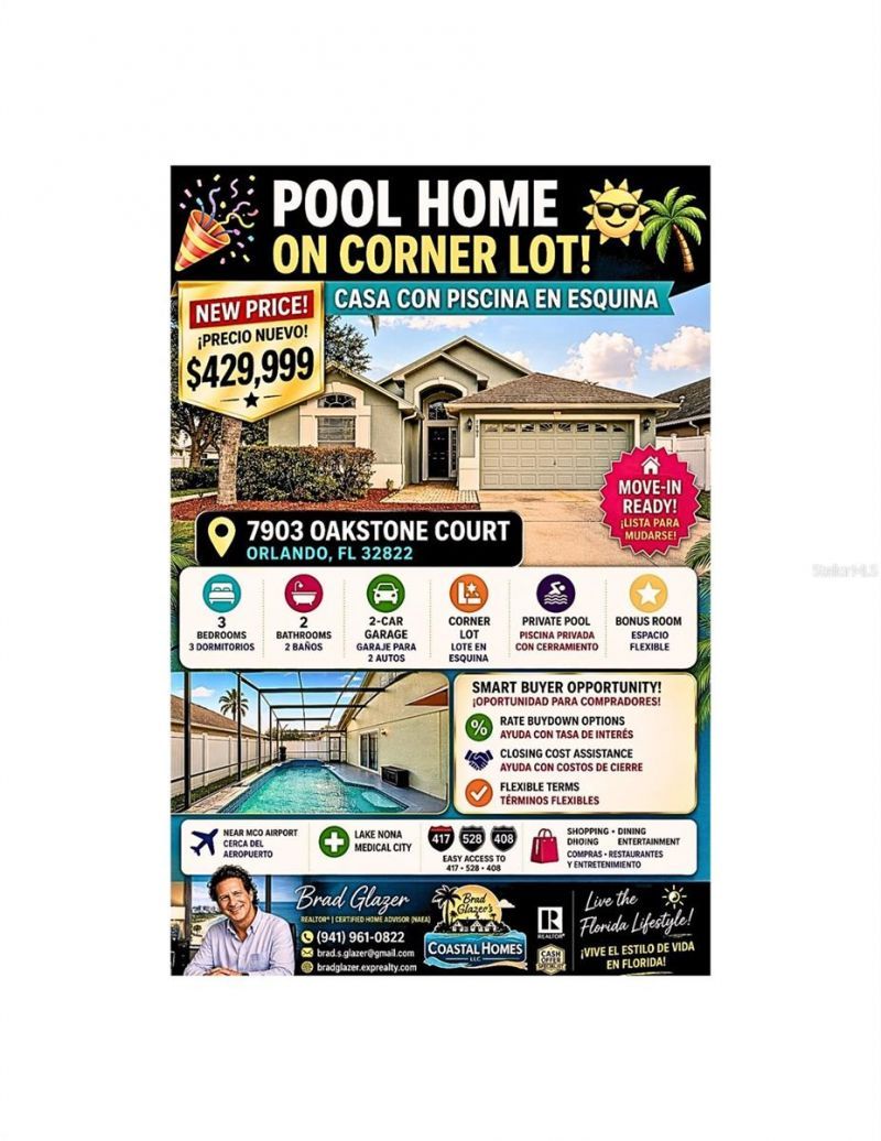 POOL HOME ON A CORNER LOT - STRATEGICALLY PRICED UNDER $430,000Now offered at $429,999, this thoughtfully repositioned pool home presents a compelling opportunity for buyers seeking value, flexibility, and long-term potential in today's market.Welcome to 7903 Oakstone Court, a move-in ready 3-bedroom, 2-bath single-story home located in the established Woodstone community of Orlando.This residence features a bright, open floor plan with a split-bedroom layout designed for both privacy and functionality. The freshly painted interior enhances natural light throughout, creating a clean and inviting atmosphere from the moment you enter.The kitchen is centrally located and includes recent appliance updates, including a new range and dishwasher. It flows seamlessly into the main living and dining areas, making the space ideal for both everyday living and entertaining.The primary suite offers additional flexibility with a private sitting area, well-suited for a home office, reading space, or personal retreat.A bonus room (no closet) provides additional usable space that can function as a media room, fitness area, or playroom depending on your needs.Step outside to a private screened-in pool, offering a true Florida lifestyle experience with space for relaxation, entertaining, and year-round enjoyment.Value and PositioningThis home has been strategically aligned with current market conditions. At $429,999, it offers a strong combination of location, features, and price point for buyers evaluating comparable options.Seller concessions may be considered, including interest rate buydown programs, closing cost assistance, repair or upgrade credits, and flexible closing terms. All terms are subject to negotiation.Property FeaturesPrivate screened-in poolCorner lotTwo-car garageLow HOA approximately $30 a monthSolid block constructionFresh interior paintNew sodMove-in ready conditionLocationConveniently located near Orlando International Airport, Lake Nona Medical City, and major highways including 417, 528, and 408, with easy access to shopping, dining, and entertainment.ClosingA well-positioned opportunity for buyers who understand the value of timing, condition, and location in today's market.