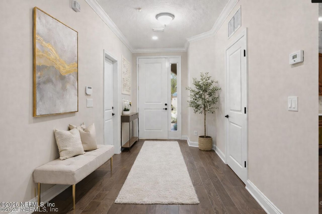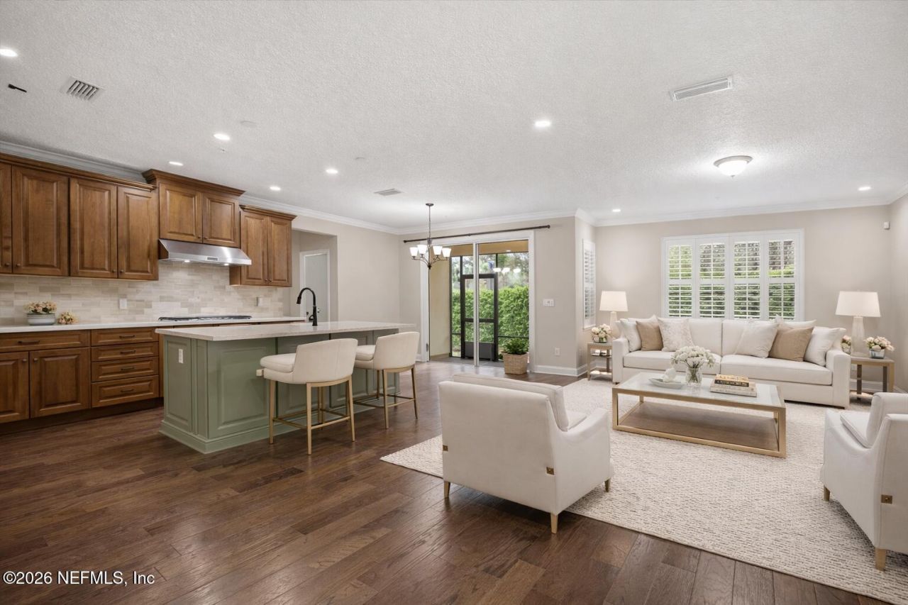 Welcome to this warm and inviting ground-level luxury carriage home offering maintenance-free living in the gated community of Coastal Oaks at Nocatee, one of the nation's most sought-after lifestyle communities. This beautifully designed residence features 2 bedrooms, 2 bathrooms, a dedicated office, and a well-appointed laundry room with built-in cabinetry and sink, combining comfort, style, and effortless living. Inside, you'll find engineered hardwood flooring throughout the main living areas and a thoughtfully designed kitchen with custom wood cabinetry, soft-close pull-out drawers, and a large island that creates a warm yet elegant gathering space. The kitchen is equipped with KitchenAid stainless steel appliances and generous workspace, making it perfect for everyday living and entertaining. The spa-inspired bathrooms feature upgraded cabinetry with abundant storage. The owner's suite includes a large walk-in closet with built-in shelving and seating area, designed for both comfort and organization. Designer tilework and high-end finishes complete the luxurious feel throughout the home. The attached two-car garage includes epoxy flooring and a water purification system, adding both functionality and Comfort. Step outside and enjoy everything Coastal Oaks has to offer. Walk to the fitness center, host gatherings at the private clubhouse, or explore the community by golf cart through Nocatee's scenic greenway trails. Residents also enjoy access to Nocatee's world-class amenities, including kayak launches, miles of nature trails, zip lines, dog parks, and the famous Splash Water Park with its lazy river. Ideally located just minutes from TPC Sawgrass, pristine Ponte Vedra beaches, and historic St. Augustine, this home truly offers the best of Northeast Florida's resort-style living.
