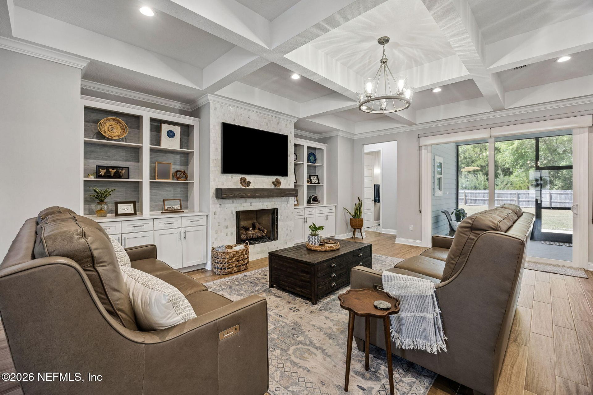 Exceptional new-construction residence (2023) on a full acre in a private cul-de-sac - a rare luxury opportunity without the burden of high HOA/CDD fees. Meticulous finishes and thoughtful design create an elegant, light-filled home with an open floor plan, stunning coffered ceiling, recessed lighting, crown molding and expansive tile floors throughout. Designer kitchen is a chef's dream: oversized island, quartz countertops, custom backsplash, 42'' cabinets with uppers to ceiling & glass-inlay's, built in oven & microwave, gas range, stainless steel hood vent, soft-close doors and pull-out drawers, and a generous breakfast nook- ideal for entertaining. The great room centers on a dramatic stone floor-to-ceiling fireplace and flows to a screened lanai overlooking a private, fully fenced acre with room for a pool, large storage shed, and expanded irrigation to the entire lot. Luxurious primary suite features a dual vanity, a spa-like tile walk-in shower and an expansive walk-in closet. Thoughtful floorplan includes split bedrooms, a private guest suite, 2 additional bedrooms Jack-and-Jill bath, formal dining and a versatile flex/office space. Custom built-ins add refined functionality. Premium systems and exterior details include hardi siding, gutters, dual water softener/filtration system, tankless water heater, six-foot privacy fencing, extended driveway, extended concrete lanai and low HOA fees. This one-of-a-kind property offers the feel of luxury living in a serene, private setting -- minutes to Fernandina Beach, I-95, Jacksonville International Airport, dining and shopping options and a short commute to downtown Jacksonville. Ready for your elevated lifestyle.