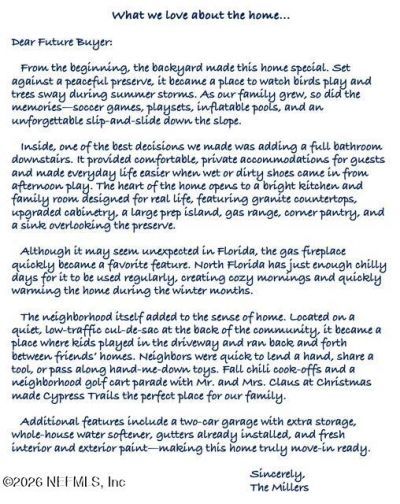 Welcome home to Cypress Trails at Nocatee, where everyday life feels just a little easier and weekends feel like a getaway. Perfectly positioned on a peaceful preserve lot, this move-in-ready home offers privacy, flexibility, and the kind of layout that truly works for how people live today.From the moment you step inside, you'll notice how thoughtfully the space is designed, no wasted square footage, just comfortable, functional living. A flexible front room greets you at the entry and can easily serve as a home office, playroom, or formal dining space depending on your needs. The heart of the home opens up to a bright kitchen and family room that's ideal for both entertaining and everyday routines.The kitchen is designed for real life, featuring granite countertops, upgraded cabinetry, a large prep island, a gas range, a corner pantry, and a sink that looks out over the quiet preserve-perfect for enjoying morning coffee while watching the backyard come to life.A first-floor bedroom and full bath make hosting guests simple or provide an excellent option for multi-generational living. Upstairs, you'll find a spacious loft that works beautifully as a second living area, game room, or homework space, along with the owner's suite, two additional bedrooms, a full bath, and a conveniently located laundry room.Step outside to the screened lanai and unwind while taking in the serene preserve views. The fully fenced backyard offers privacy and plenty of room to add a pool, garden, or play area creating your own outdoor retreat.Additional features include a two-car garage with extra storage, whole-house water softener, gutters already installed, and fresh interior and exterior paint, giving you peace of mind and a truly move-in-ready experience.Living in Cypress Trails means enjoying everything Nocatee is known for top-rated schools, resort-style pools, fitness centers, miles of trails, parks, and endless opportunities to get outside and connect with the community.This is more than just a house it's a place to settle in, spread out, and enjoy the Nocatee lifestyle so many people are searching for.Nocatee offers an unparalleled lifestyle with a wide range of amenities designed for all ages and interests. Highlights include:Splash Water Park featuring the thrilling Rip Tide Slide, Lazy Tides River, Splash Cove, lagoon pool, a 330-foot zip line, and a swim club pool.Fitness Club with state-of-the-art cardio and weight equipment, free weights, and fitness classes.Greenway Trails, perfect for hiking and biking, spanning approximately 2,400 acres of stunning natural beauty along a 3.5-mile stretch of the Intracoastal Waterway.Dog Parks catering to your furry friends.Spray Park located behind the Nocatee Swim Club, offering even more water-filled fun for all.Nocatee continues to grow and enhance its offerings, with recent updates and expansions to the Splash and Spray Parks.With countless activities, stunning natural surroundings, and a strong sense of community, Nocatee is truly a wonderful place to call home.
