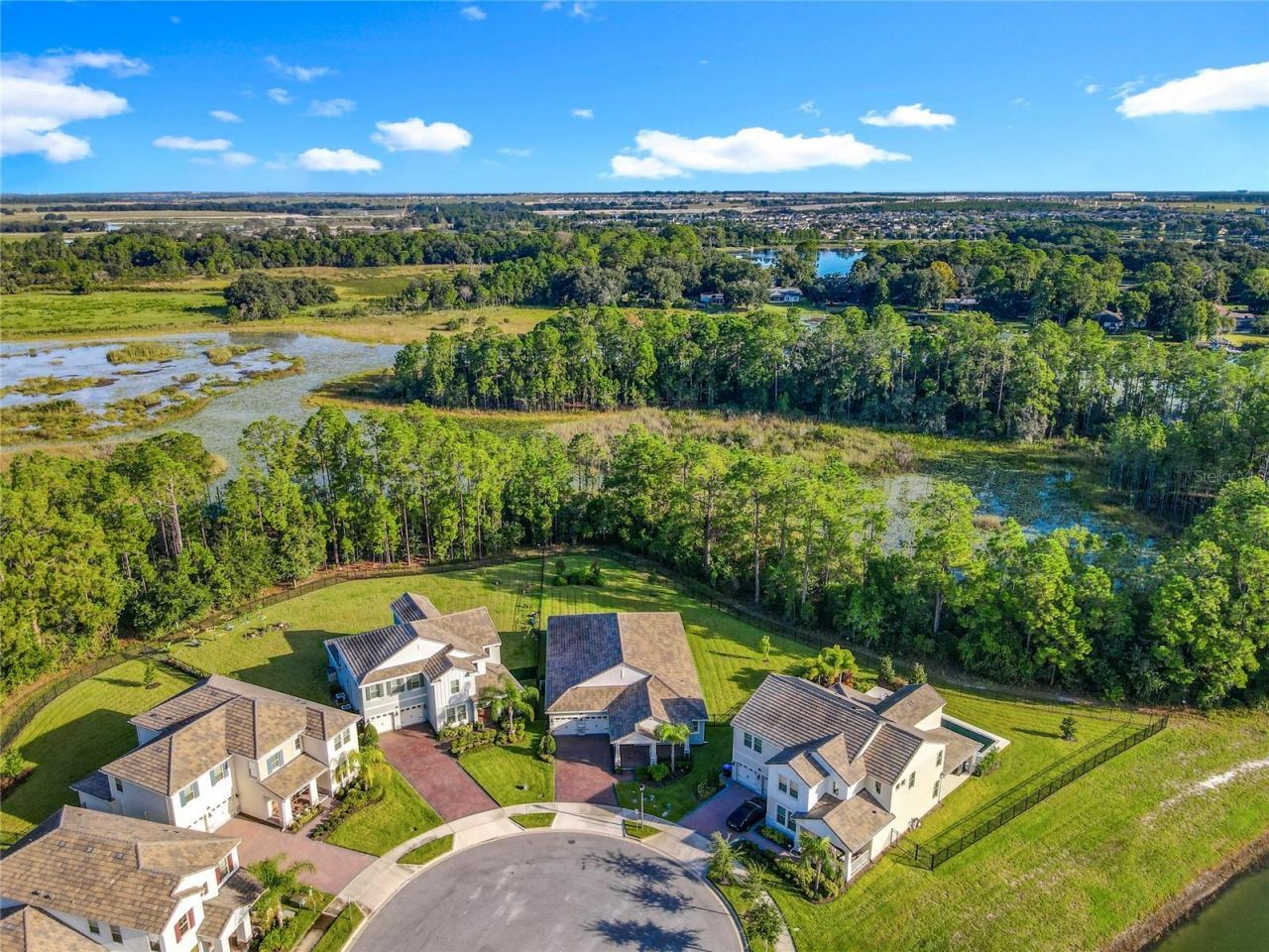 Nestled in Phase 3 of Waterleigh in Horizon West, this stunning single-story home offers 4 bedrooms and 3.5 bathrooms on a premium .41-acre lot with no rear neighbors, providing both privacy and tranquility. Situated on a quiet cul-de-sac, the home features beautiful views and a peaceful setting, just a short stroll from a charming community green space with a pavilion and picnic area. Inside, you'll find wood-look tile flooring throughout the main living areas, and bedrooms with new engineered wood flooring recently added. The spacious master suite boasts a large walk-in closet, dual vanities, a soaking tub, and a glass-enclosed shower. A second bedroom at the front of the home offers its own private bathroom and walk-in closet, ideal for guests or multigenerational living. The chef's kitchen features sleek quartz countertops, stainless steel appliances, and a functional layout perfect for entertaining. The laundry room has been upgraded with a new washer, dryer, refrigerator, sink, and added shelving for extra storage. Additional highlights include a 3-car garage with new epoxy flooring and Tesla EV charger outlet, recently sealed driveway and lanai, and newly installed rain gutters. Enjoy low-maintenance living with lawn and shrub care included in the HOA. Waterleigh offers a wide range of resort-style amenities, including three pools, fitness centers, community clubhouses, mini golf, dog parks, and scenic walking trails. Conveniently located near Publix and just a short drive to many restaurants and Disney World. This home combines luxury, comfort, and convenience.