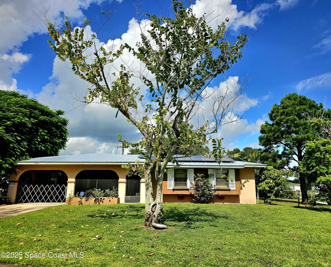 Metal roof installed in 2021. Easy to use accordion shutters installed in 2020, offering peace of mind, as well as those insurance deductions! Beautiful French doors with integrated blinds lead out to the huge back yard- so no annoying sliding doors! Photovoltaic solar module system installed in 2024 to cut those electric bills. The large interior laundry room is super convenient and offers a surplus of storage space. The welcoming screened front patio offers additional space for morning coffee or evening relaxation. There is a covered carport, a storage shed in the backyard and the location is super convenient to shopping, medical centers ,and the beaches. This oversized corner lot home in a non HOA community is ready for a new owner!