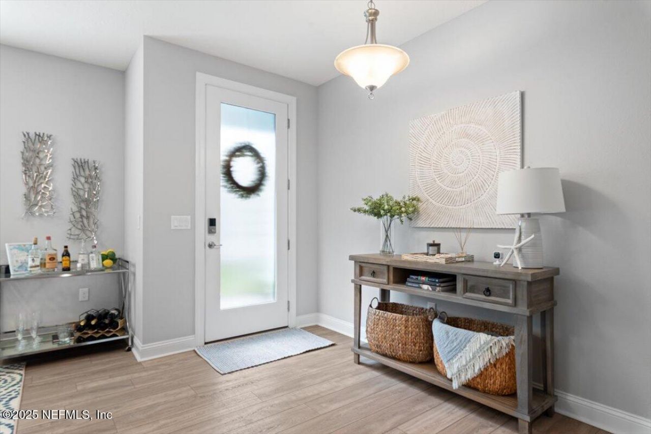 Welcome to Edison East Villas, where modern design meets effortless living. This Toll Brothers villa combines low-maintenance convenience with upscale finishes, creating a home that feels both refined and inviting from the moment you step inside.Inside, the atmosphere is calm, elevated, and complete. Luxury vinyl plank flooring flows seamlessly through the main living spaces, accented by a tray ceiling in the living room and extra recessed lighting for a warm, inviting glow. The gourmet kitchen is a true centerpiece, featuring quartz countertops, elegant pendant lighting, designer tile, and upgraded cabinetry. A built-in desk provides a functional workspace, while blinds throughout add comfort and privacy.The primary suite impresses with a four-foot extension for added space and versatility. The guest bath showcases stylish tile finishes, while the screened-in porch invites you to relax and enjoy serene preserve views. Additional conveniences include an epoxy-coated garage floor, pre-plumbing for a water softener, and pre-plumbing for a future outdoor kitchen making this home both beautiful and practical.Nestled within eTown, one of Jacksonville's premier master-planned communities, this villa offers turnkey tranquility with quick access to Mayo Clinic, fine dining, shopping, and the vibrant energy of St. Johns Town Center.